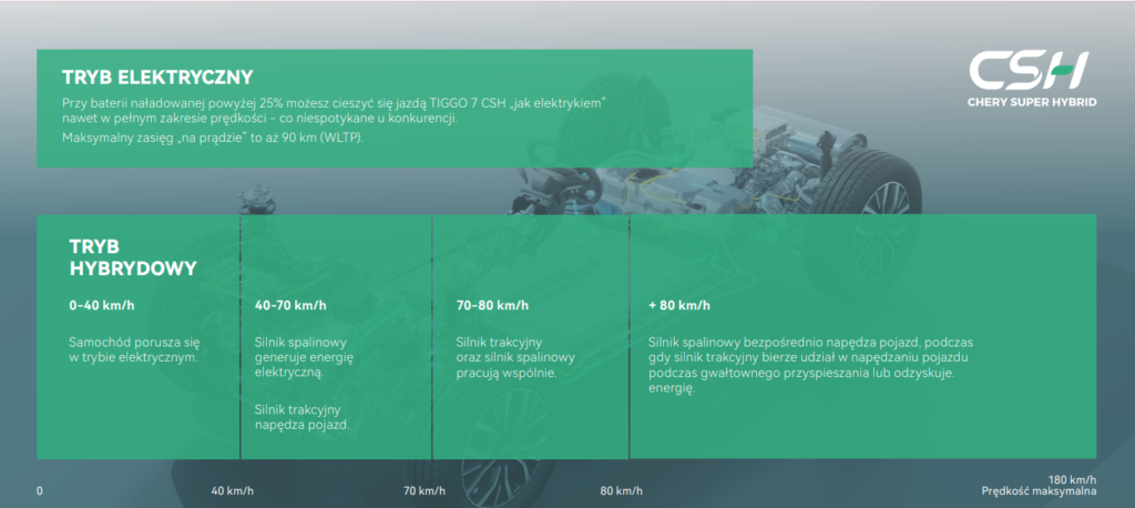 Napęd CSH to zaawansowana hybryda plug-in, w której główną rolę odgrywa silnik elektryczny, a jednostka spalinowa pełni funkcję wsparcia – zarówno jako generator, jak i źródło napędu przy wyższych prędkościach. Całość zaprojektowano tak, aby maksymalnie wykorzystać zalety jazdy elektrycznej bez typowych ograniczeń klasycznych hybryd.