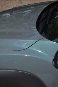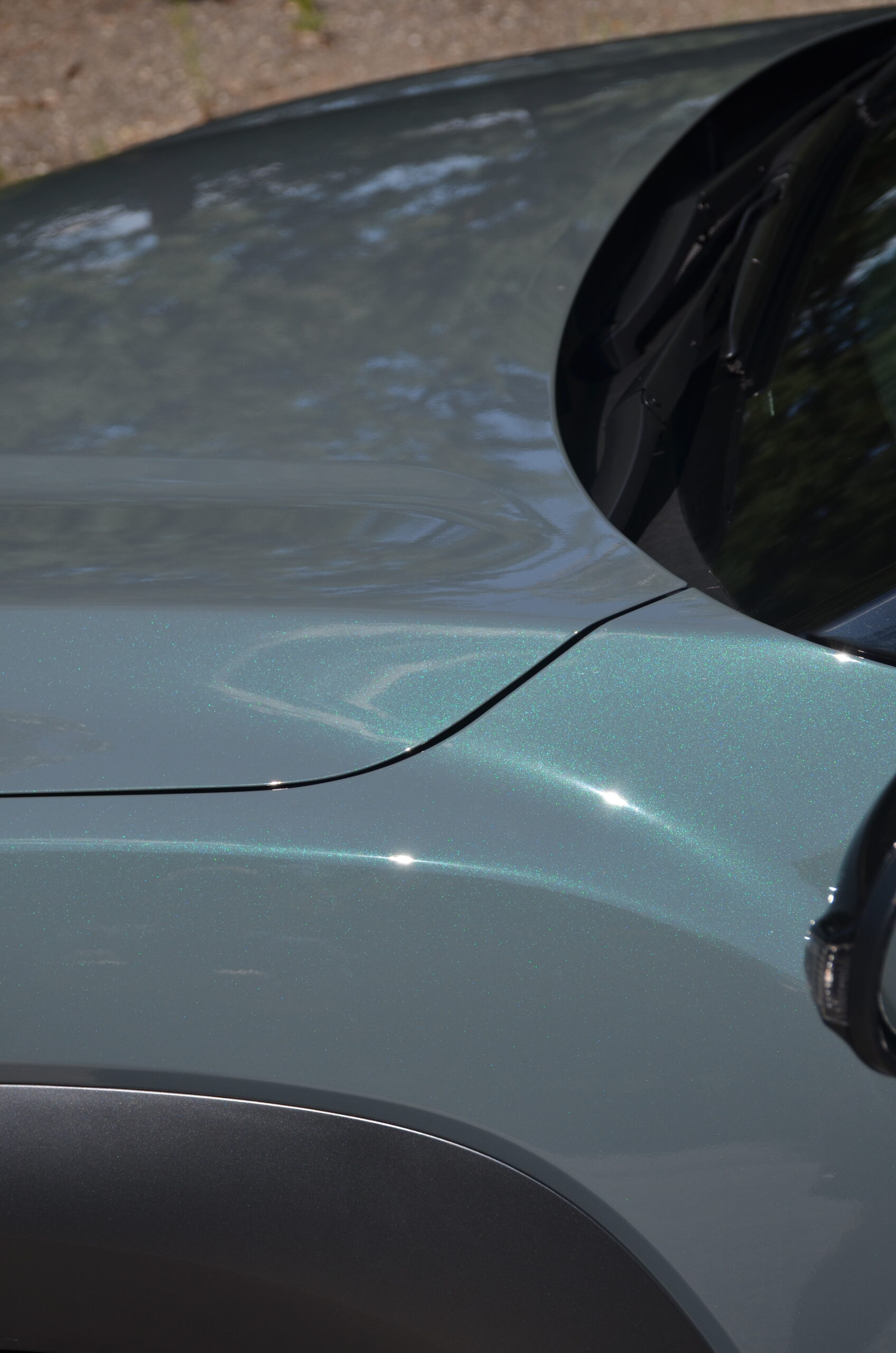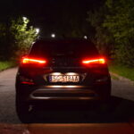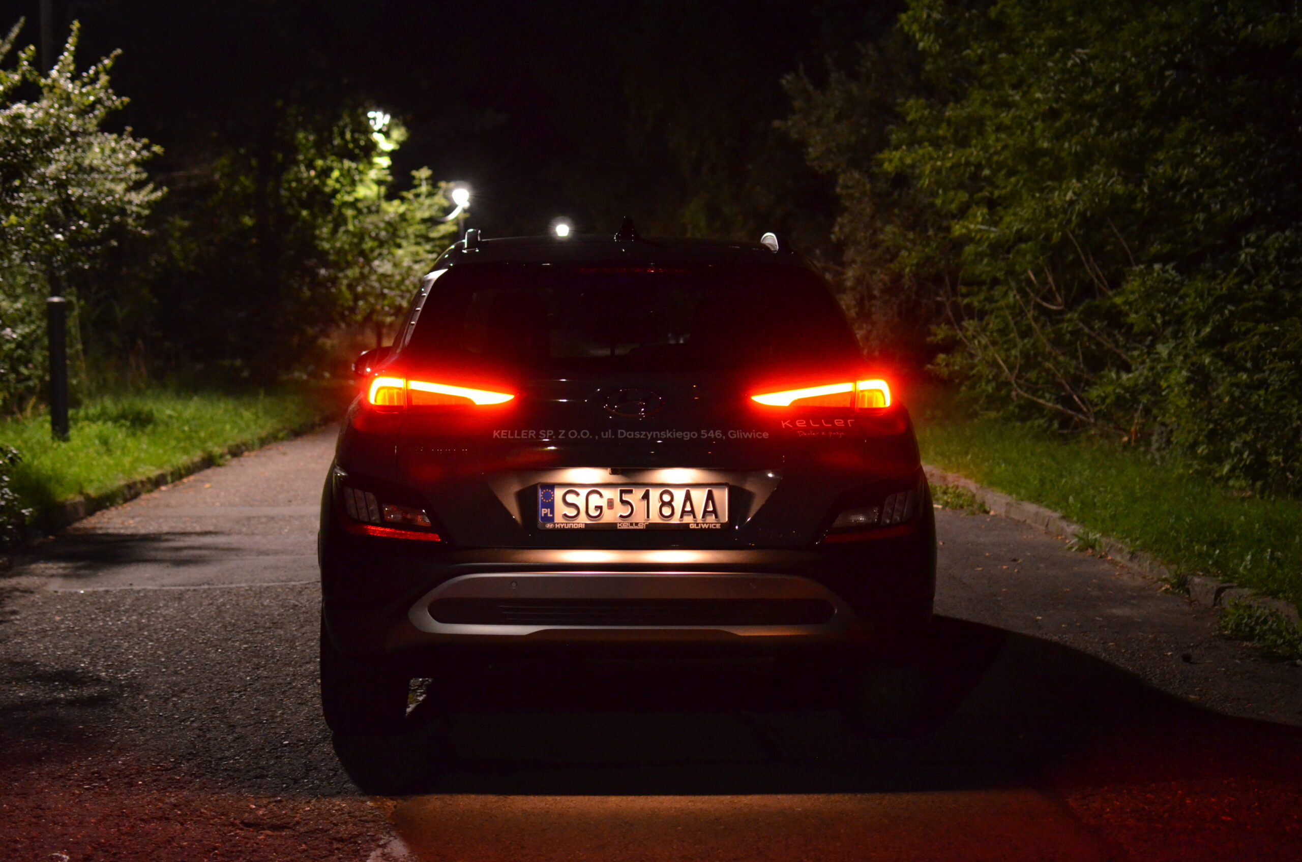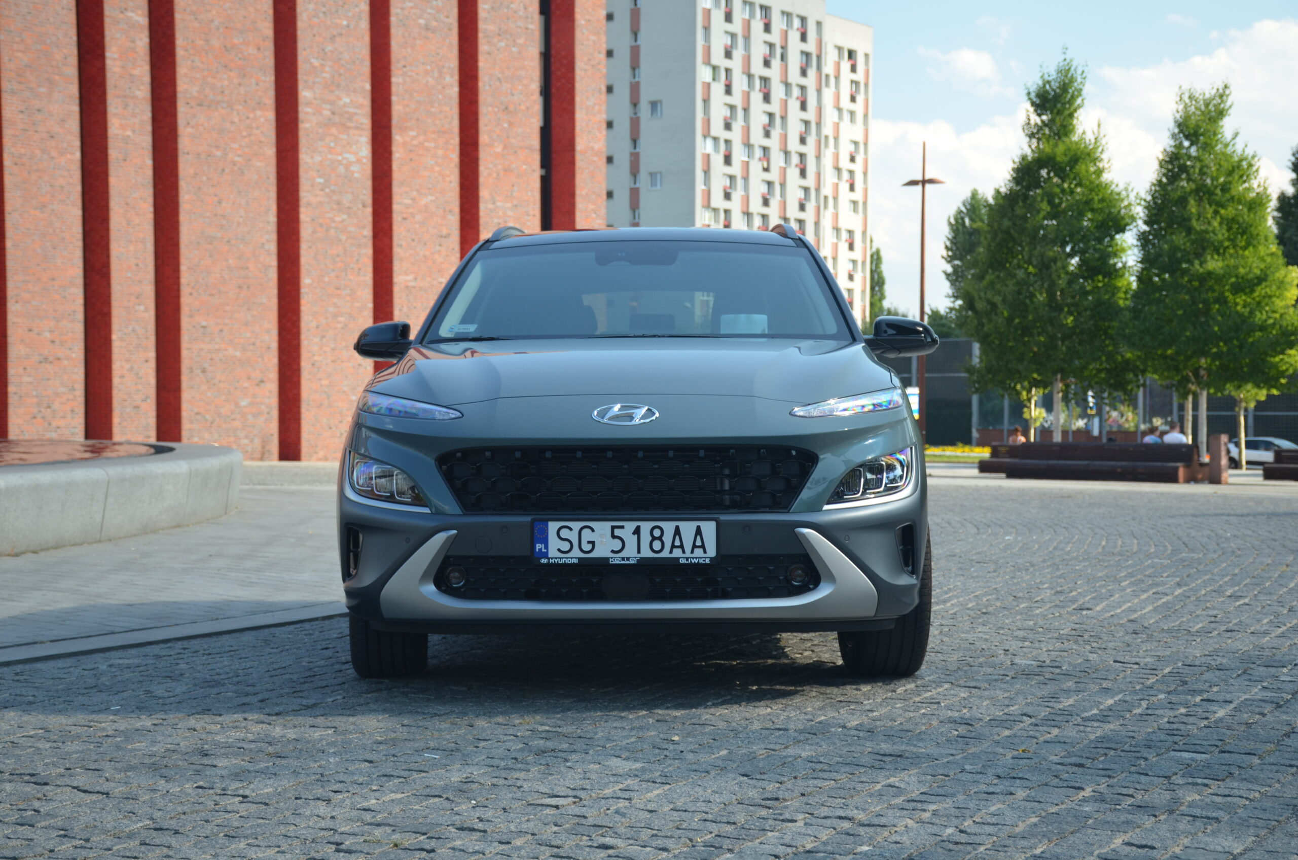 Pierwszą kwestią, którą chcę poruszyć jest wygląd. Nowa Kona jest o wiele ładniejsza od swojej poprzedniczki. Poprzez zmianę przedniego zderzaka oraz przednich reflektorów zyskała trochę agresywności, stała się po prostu atrakcyjniejsza i bardziej nowoczesna. Dużą rolę odegrał również opcjonalny lakier, który znajdował się na testowym egzemplarzu. W cieniu wygląda jak zwykły szary niemetalizowany, jednak jeśli pada na niego światło, mieni się odcieniami zielonego i niebieskiego koloru.