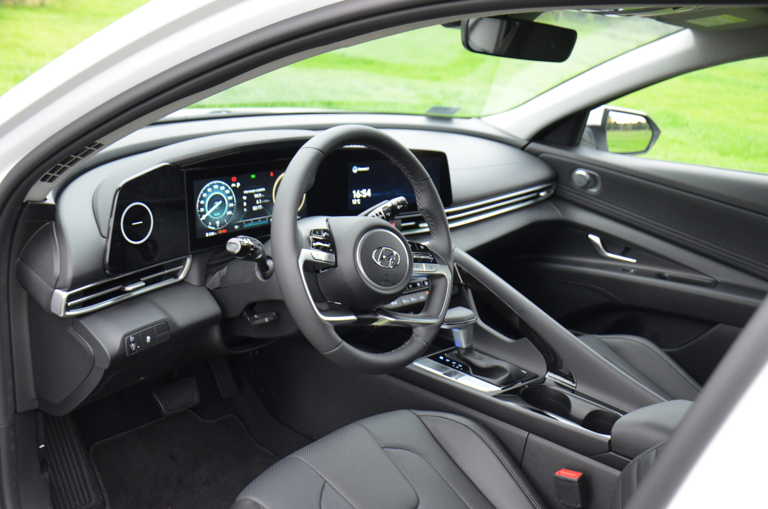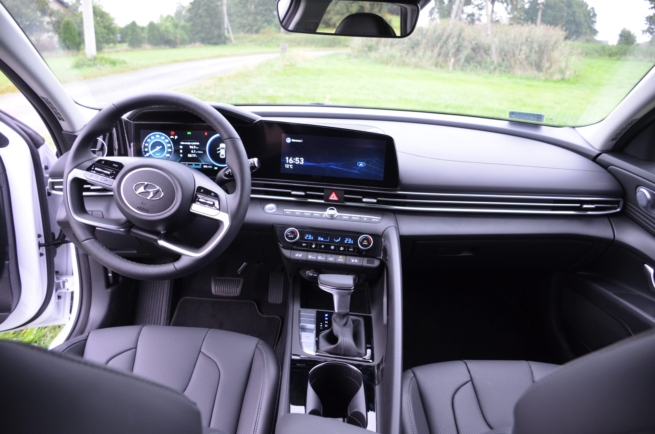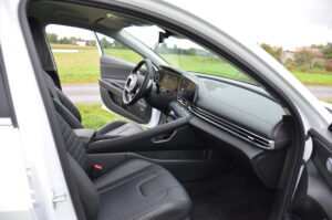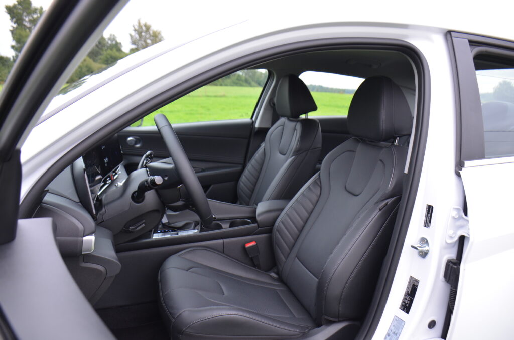Wnętrze nowej Elantry wygląda bardzo świeżo i oryginalnie. Patrząc na dwa ekrany za kierownicą, pierwsze moje skojarzenie to wyświetlacze z Mercedesa klasy E. W środku możemy zauważyć trochę smaczków stylistycznych, bardzo estetycznie zaprojektowaną deskę rozdzielczą, a z pakietem Leather możemy cieszyć się naprawdę wygodnymi i ładnymi skórzanymi fotelami. Ze smaczków stylistycznych możemy wyróżnić maskownice głośników wysokotonowych, obszycie boczków drzwi oraz oświetlenie ambiente umieszczone pod listwami maskującymi i łączącymi nawiewy w kokpicie. Elementem, którego zastosowania nie widzę, a na który narzekały osoby ze mną podróżujące, był uchwyt, przy tunelu środkowym oddzielający pasażera od kierowcy. Spotkałem się nawet z opinią, że przez ten uchwyt pasażer czuje się jakby siedział w wózku bocznym doczepionym do motocykla.