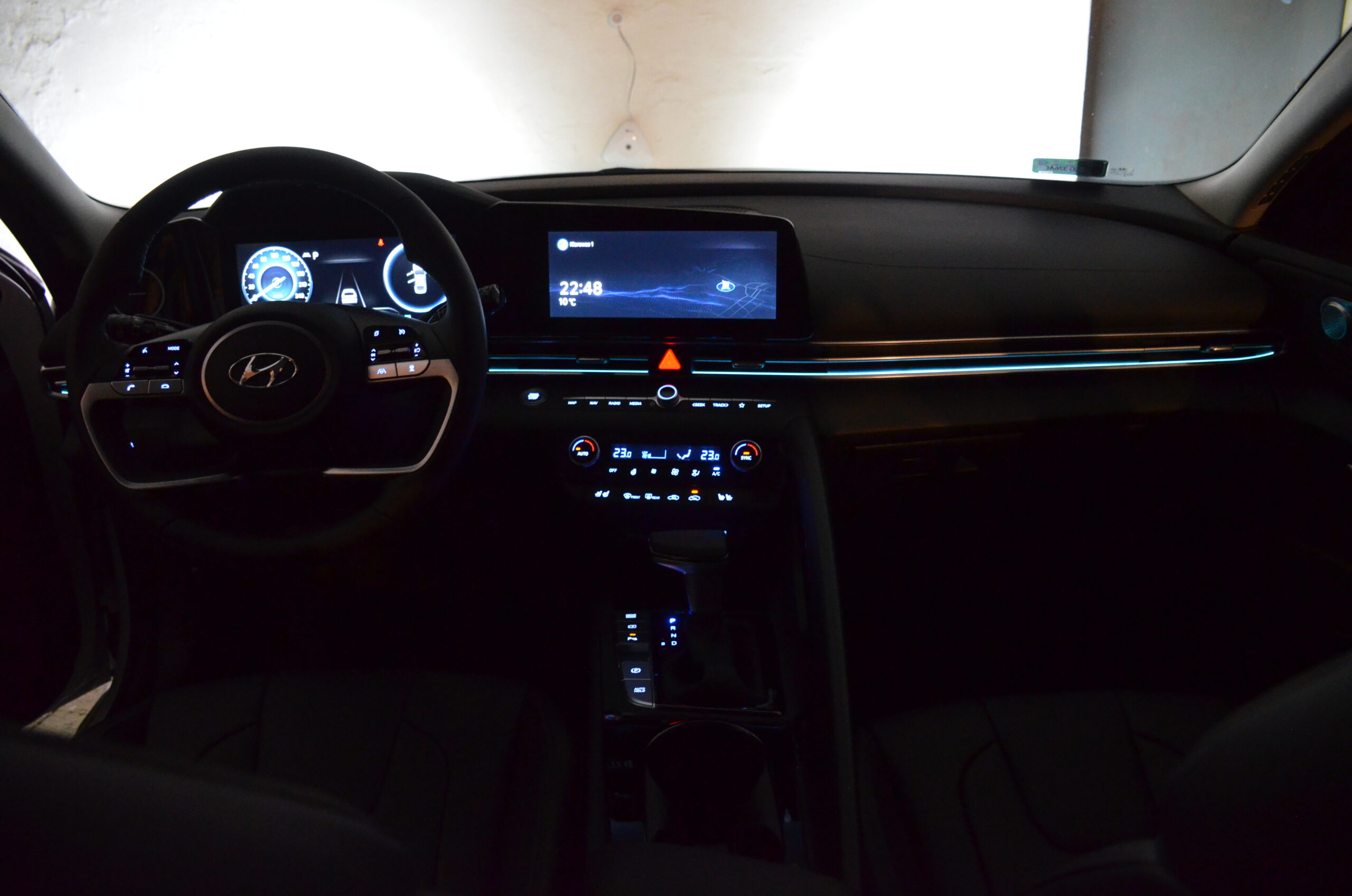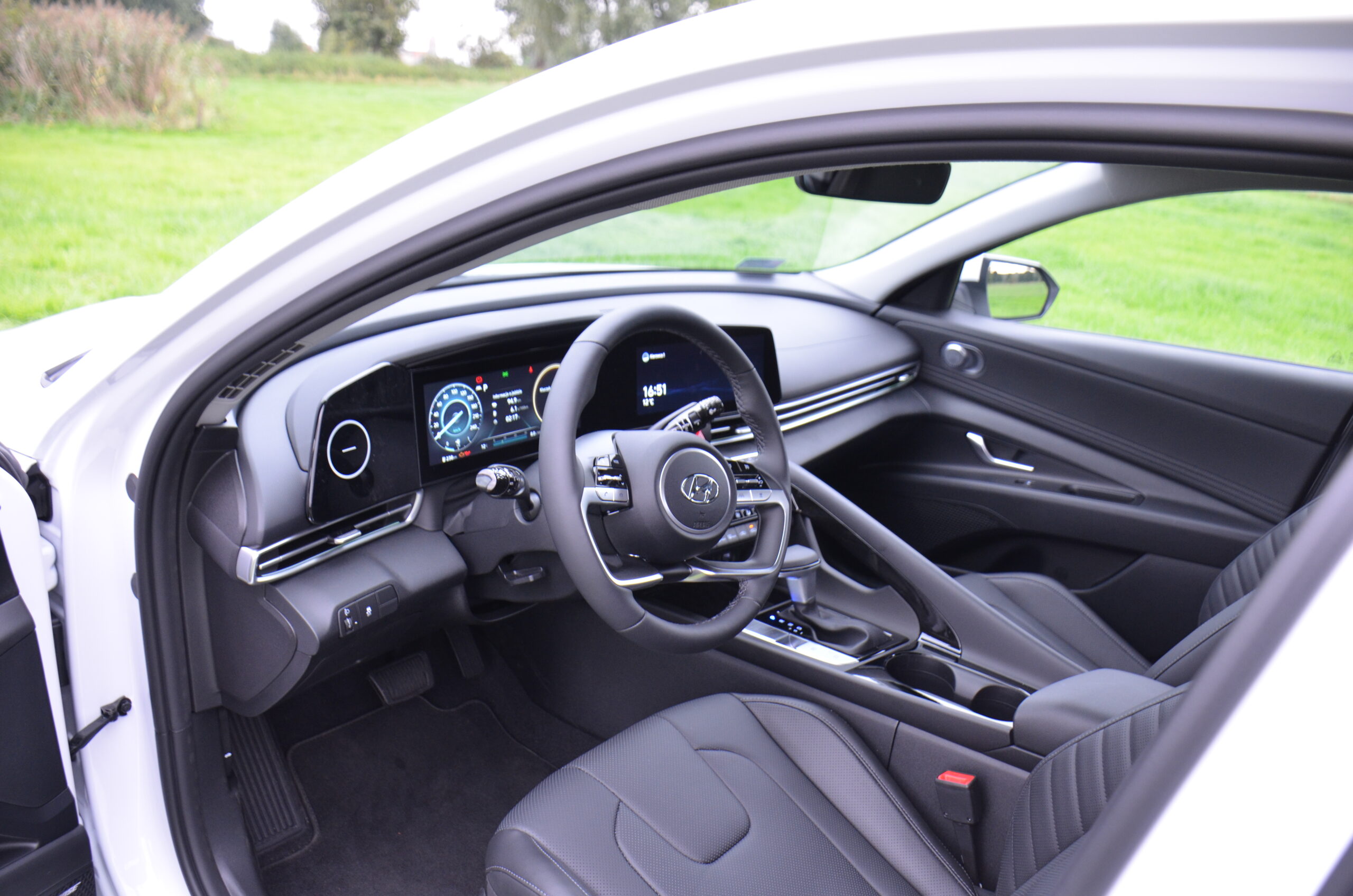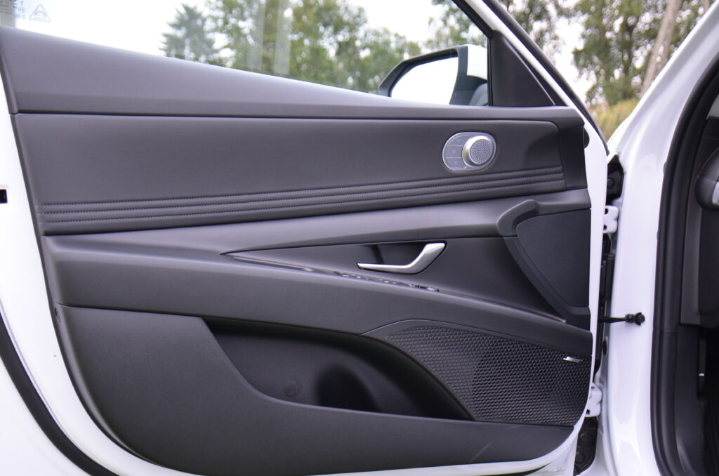 Wnętrze nowej Elantry wygląda bardzo świeżo i oryginalnie. Patrząc na dwa ekrany za kierownicą, pierwsze moje skojarzenie to wyświetlacze z Mercedesa klasy E. W środku możemy zauważyć trochę smaczków stylistycznych, bardzo estetycznie zaprojektowaną deskę rozdzielczą, a z pakietem Leather możemy cieszyć się naprawdę wygodnymi i ładnymi skórzanymi fotelami. Ze smaczków stylistycznych możemy wyróżnić maskownice głośników wysokotonowych, obszycie boczków drzwi oraz oświetlenie ambiente umieszczone pod listwami maskującymi i łączącymi nawiewy w kokpicie. Elementem, którego zastosowania nie widzę, a na który narzekały osoby ze mną podróżujące, był uchwyt, przy tunelu środkowym oddzielający pasażera od kierowcy. Spotkałem się nawet z opinią, że przez ten uchwyt pasażer czuje się jakby siedział w wózku bocznym doczepionym do motocykla.