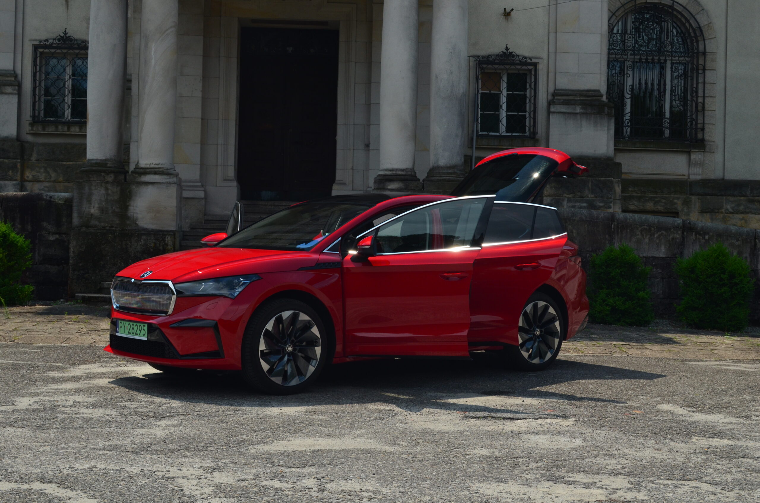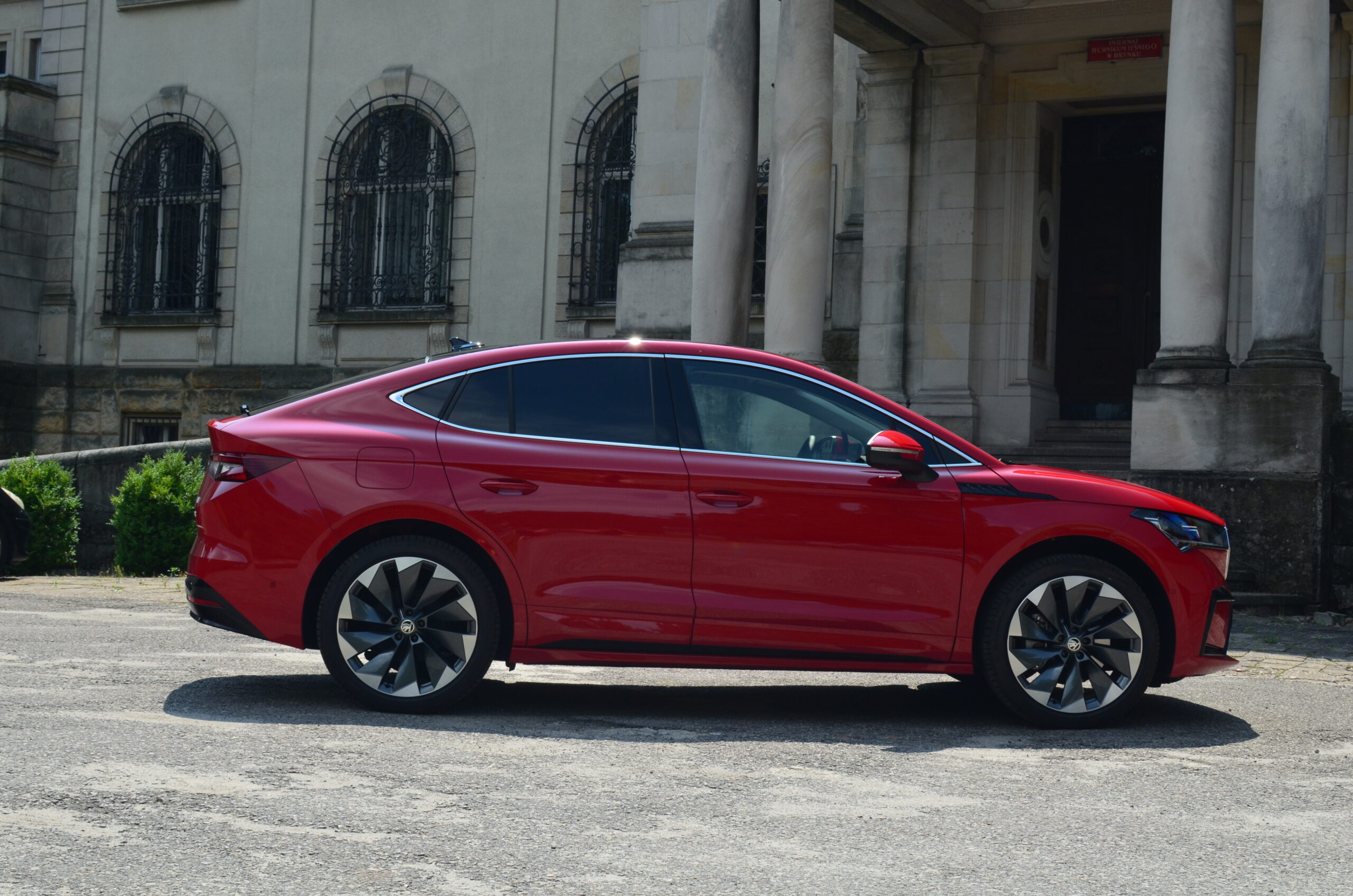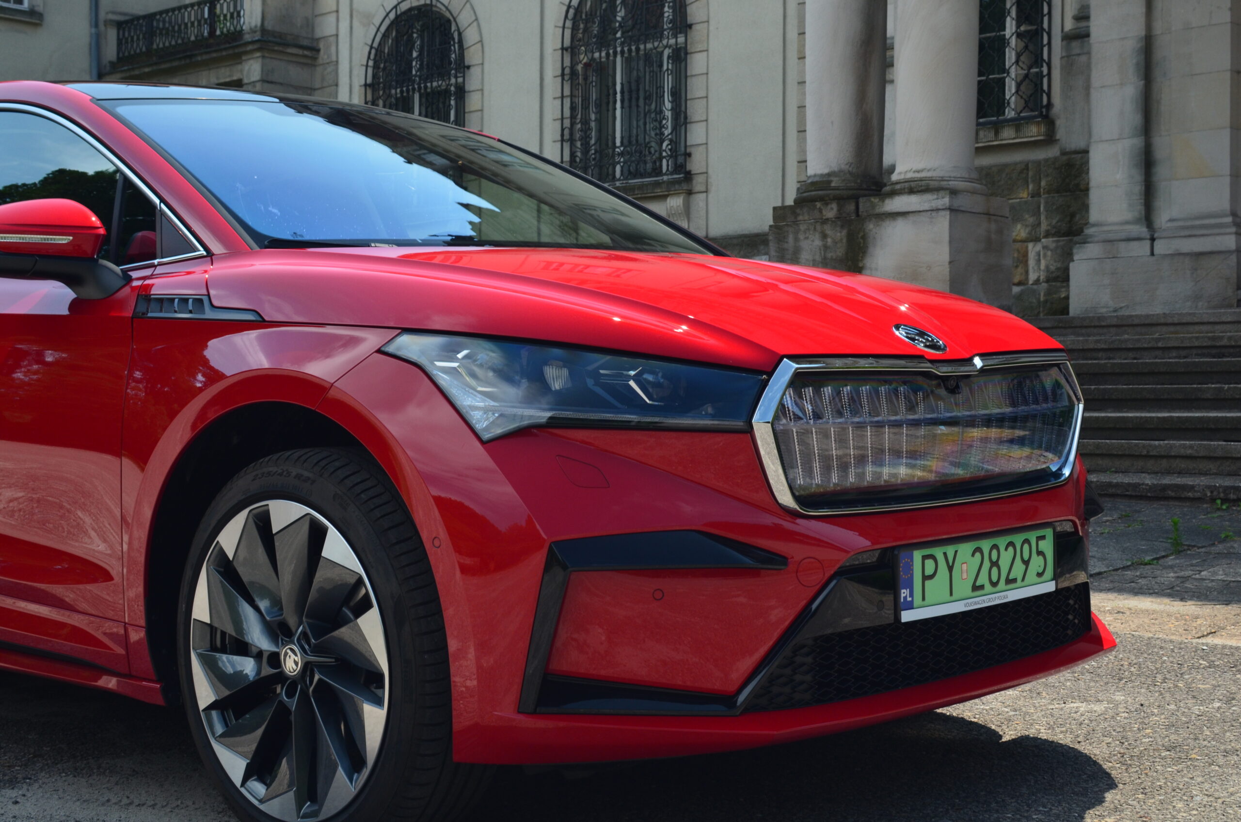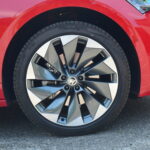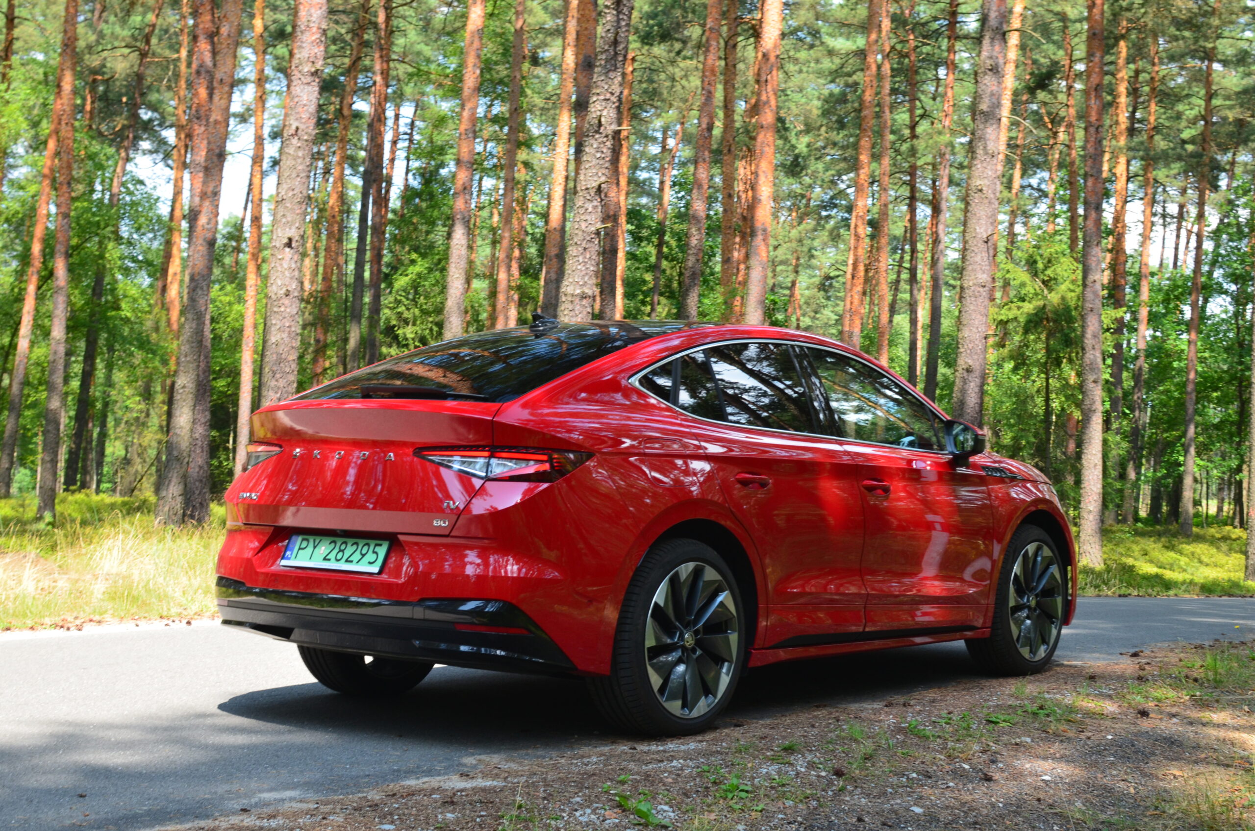 Z boku elektryczny SUV przyciąga wzrok designerskimi 21-calowymi felgami, których unikatowy wzór doskonale harmonizuje z dynamicznym wyglądem nadwozia. Dodatkowo, w testowanym egzemplarzu czerwony kolor nadwozia nadaje Enyaq’owi sportowego pazura, sprawiając, że pojazd emanuje pewnością siebie i charakterem.