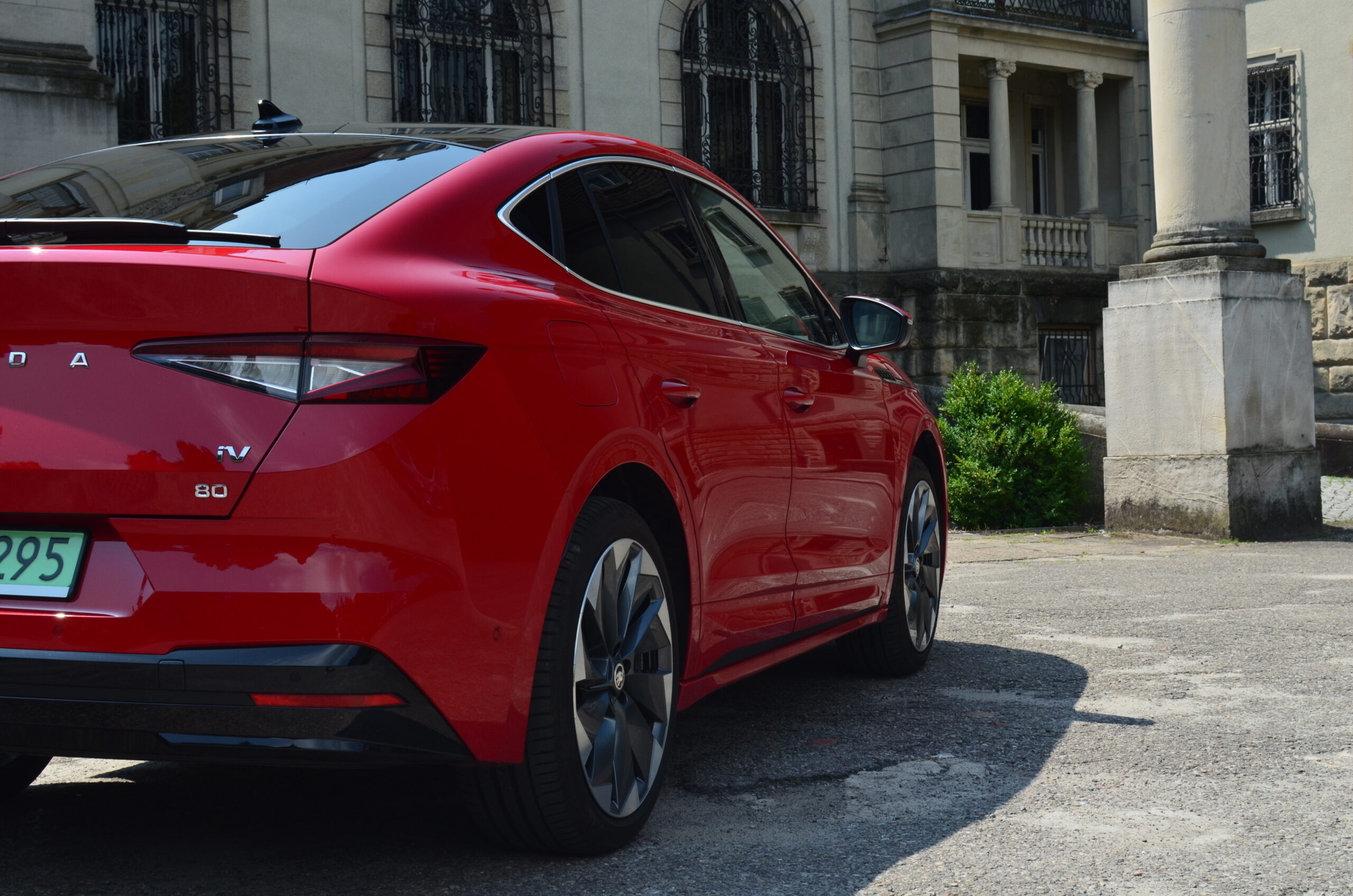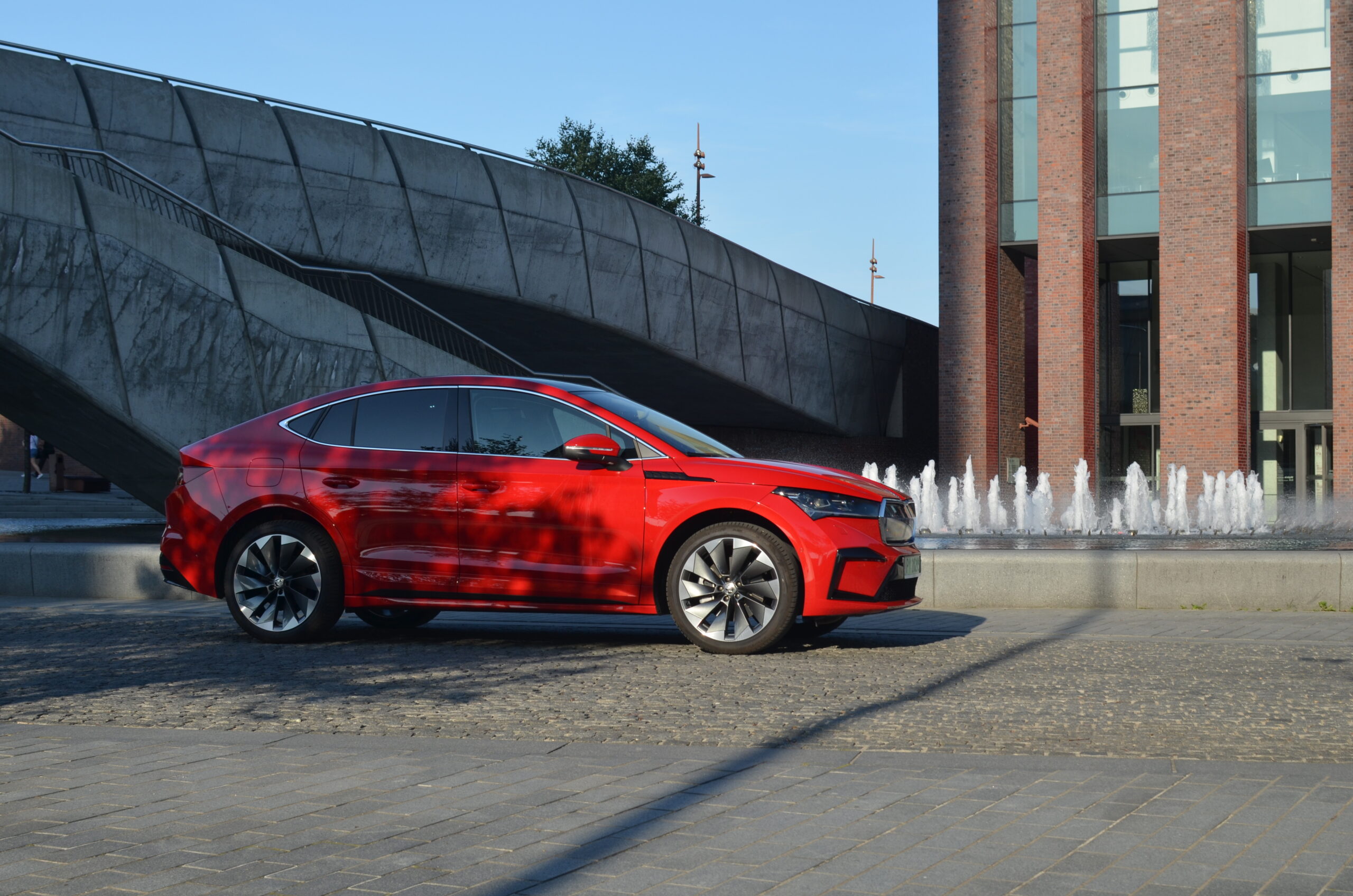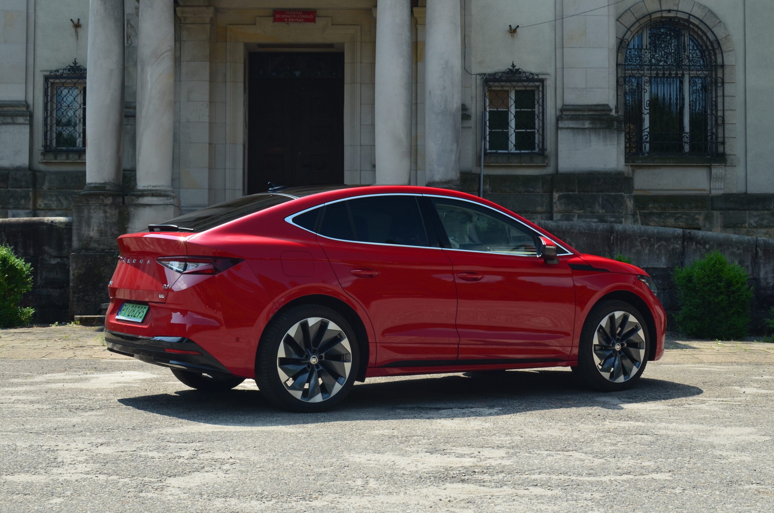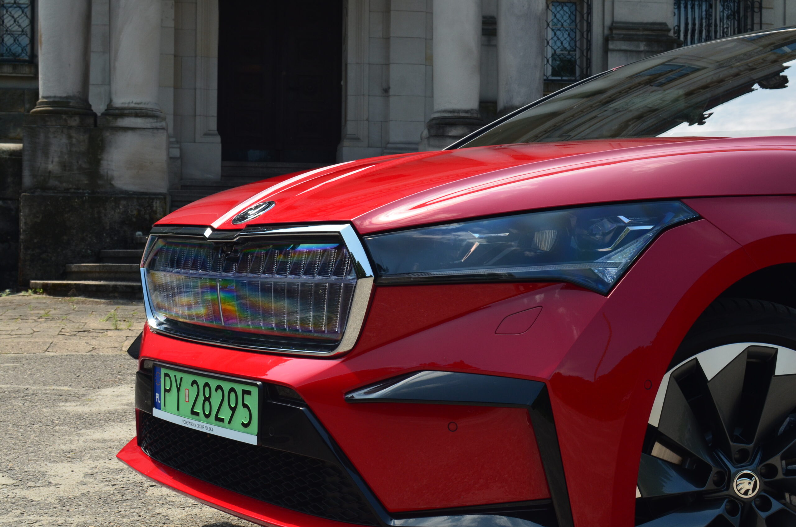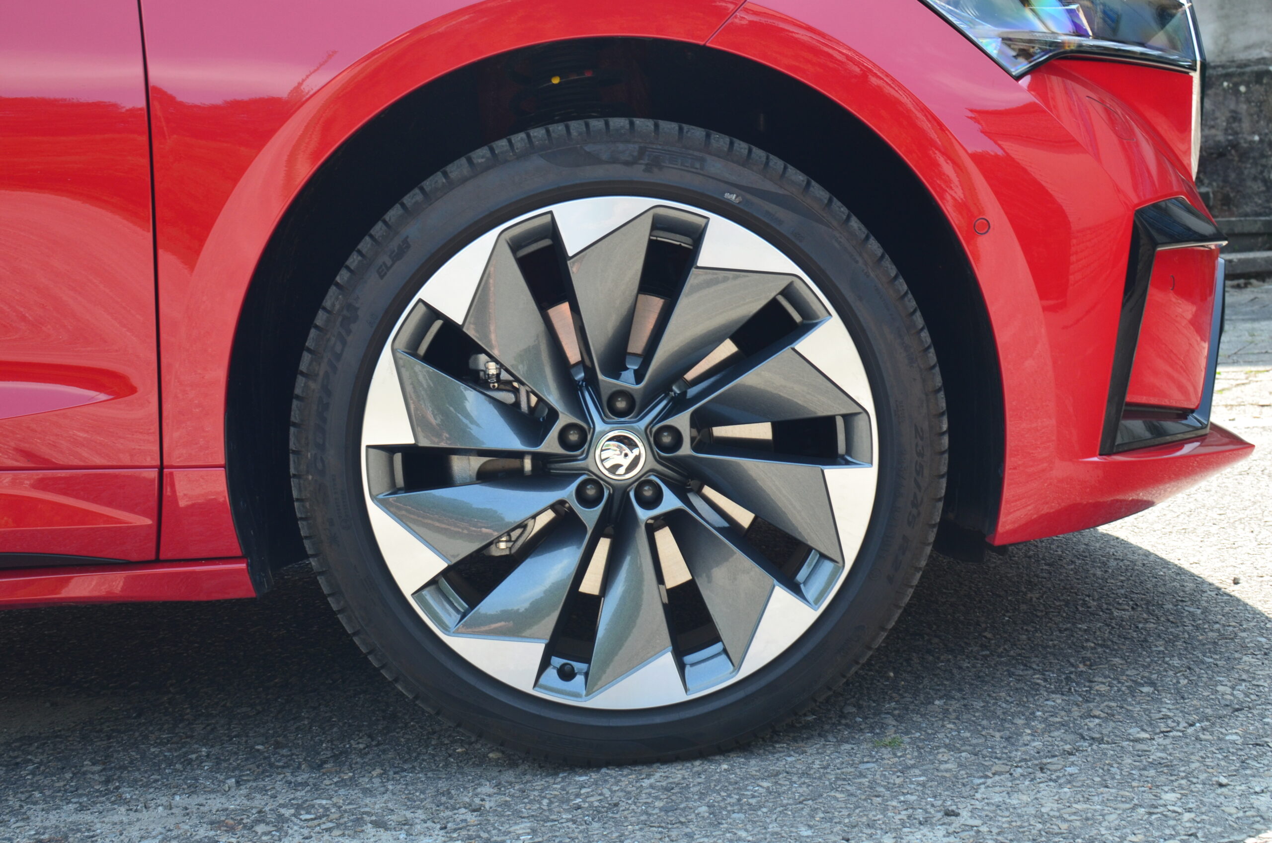 Z boku elektryczny SUV przyciąga wzrok designerskimi 21-calowymi felgami, których unikatowy wzór doskonale harmonizuje z dynamicznym wyglądem nadwozia. Dodatkowo, w testowanym egzemplarzu czerwony kolor nadwozia nadaje Enyaq’owi sportowego pazura, sprawiając, że pojazd emanuje pewnością siebie i charakterem.