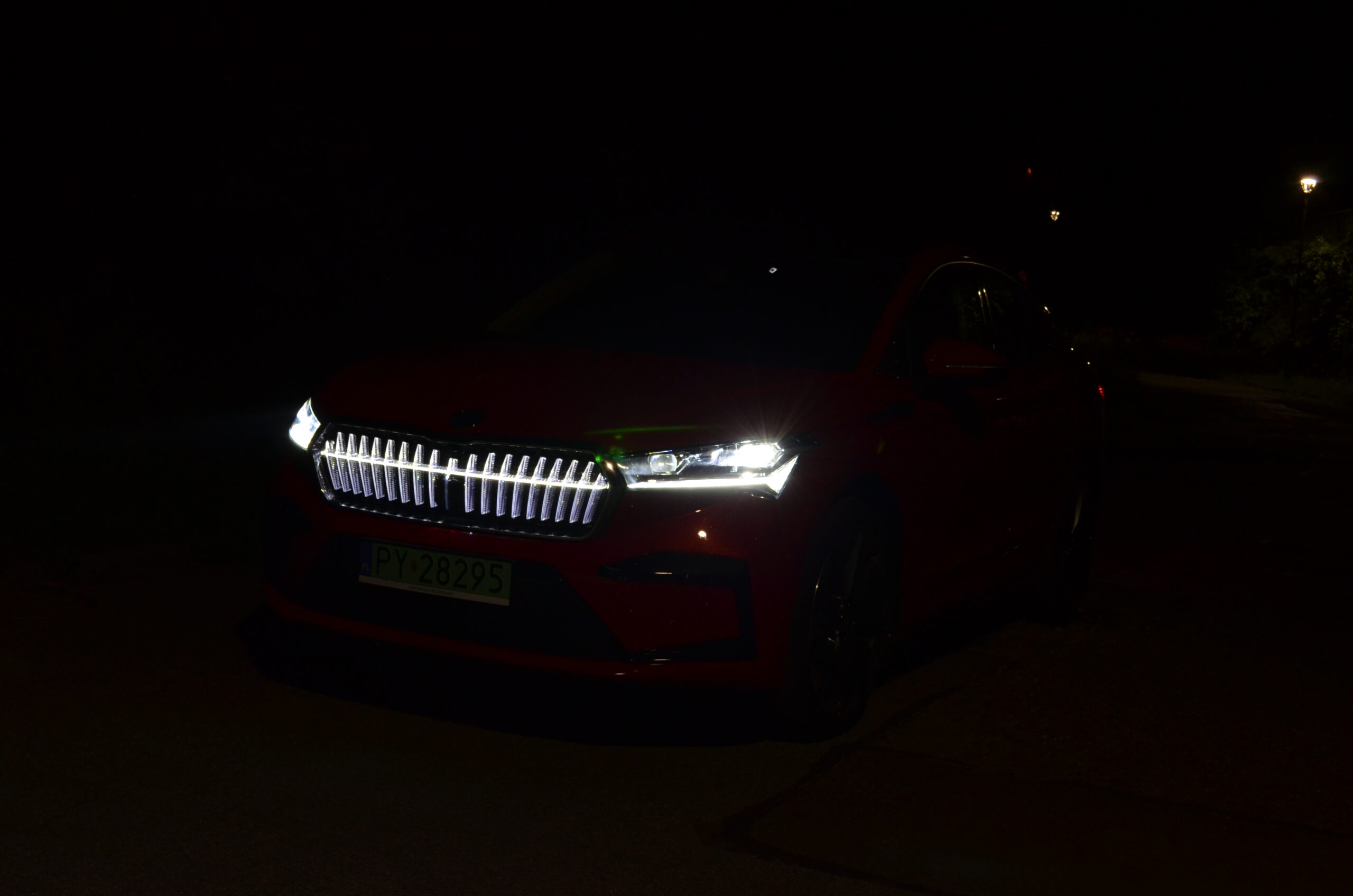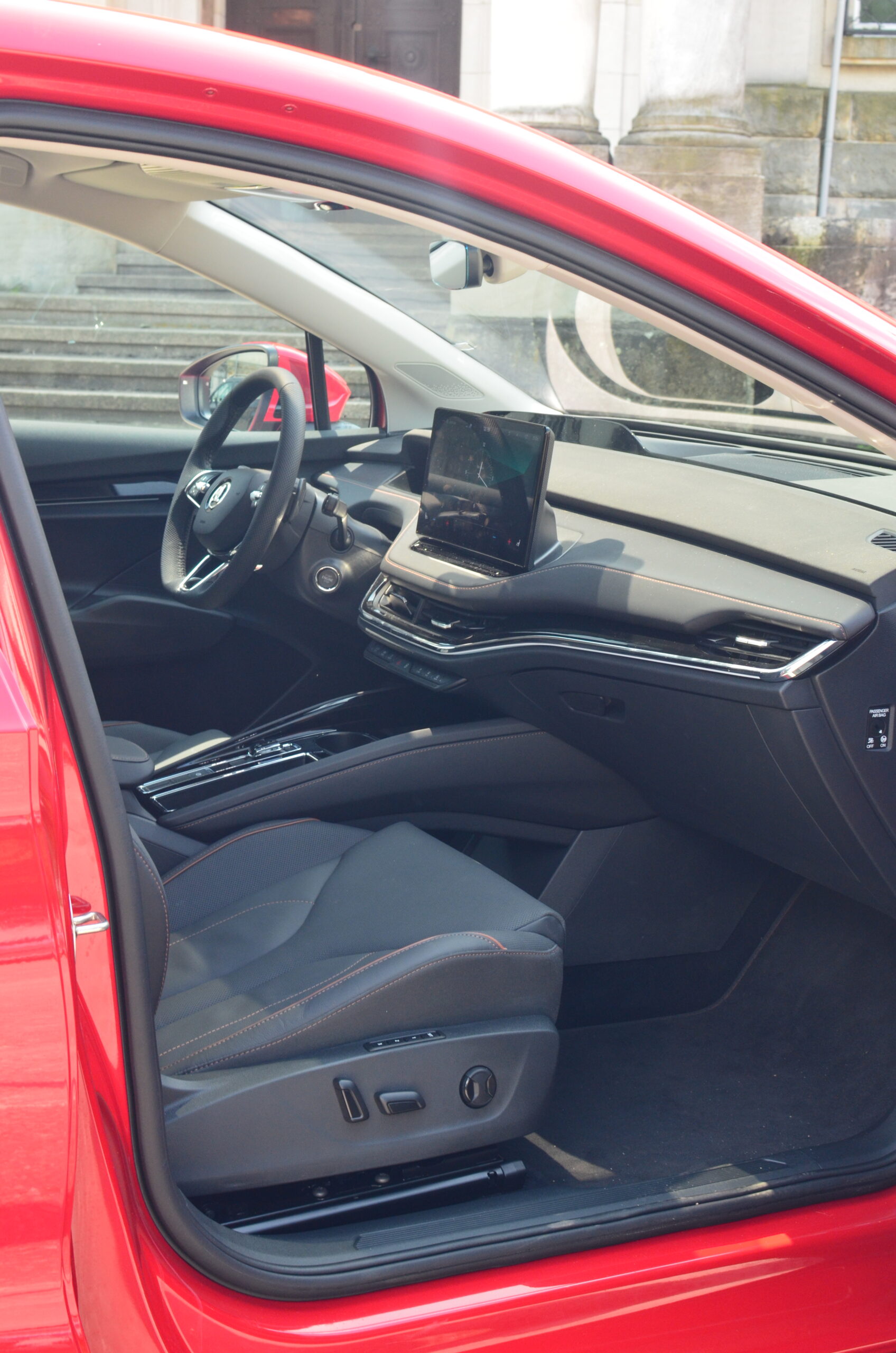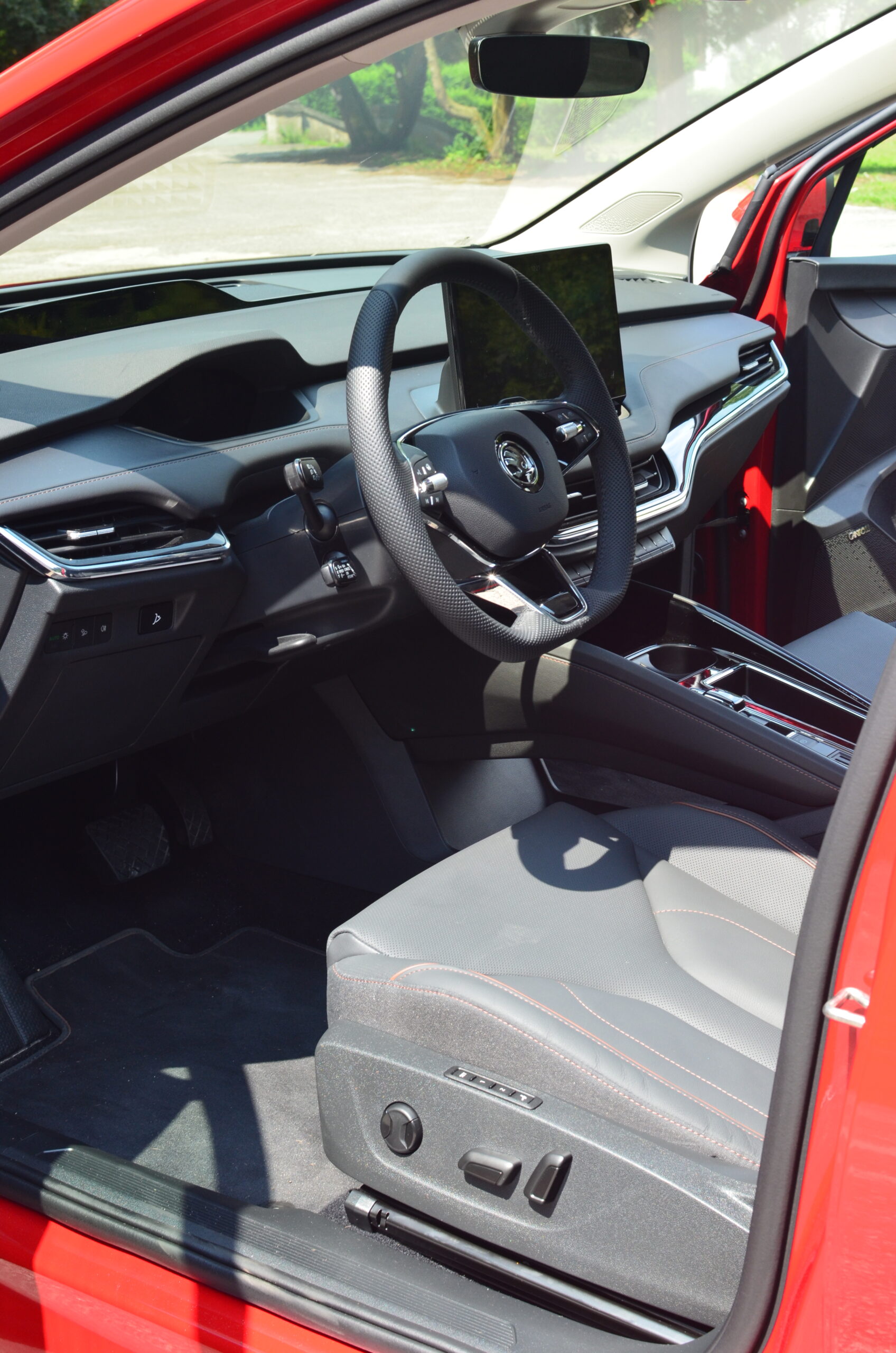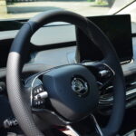 Materiały wykorzystane do wykończenia wnętrza są dobrej jakości, a ciekawe kontrastujące elementy, jak np. aluminiowe wstawki czy przeszycia w innym kolorze sprawiają, że całość prezentuje się stylowo i elegancko. Niestety będąc przy materiałach i wnętrzu muszę wspomnieć o spasowaniu, które w naszym egzemplarzu było… kiepskie. Przy trochę głośniejszym słuchaniu muzyki (około ¼ głośności) z okolic drzwi pasażera dobiegały wibracje, a na nierówności pojawiały się dziwne skrzypnięcia i stuknięcia z tylnej części pojazdu. Co ważne, kiedy odbierałem samochód, miał on nieco ponad 2900 kilometrów przebiegu. Rozumiem, że konstrukcja jest sztywniejsza przez umieszczenie akumulatorów w podłodze, ale jest to sfera, nad którą Skoda musi jeszcze trochę popracować.