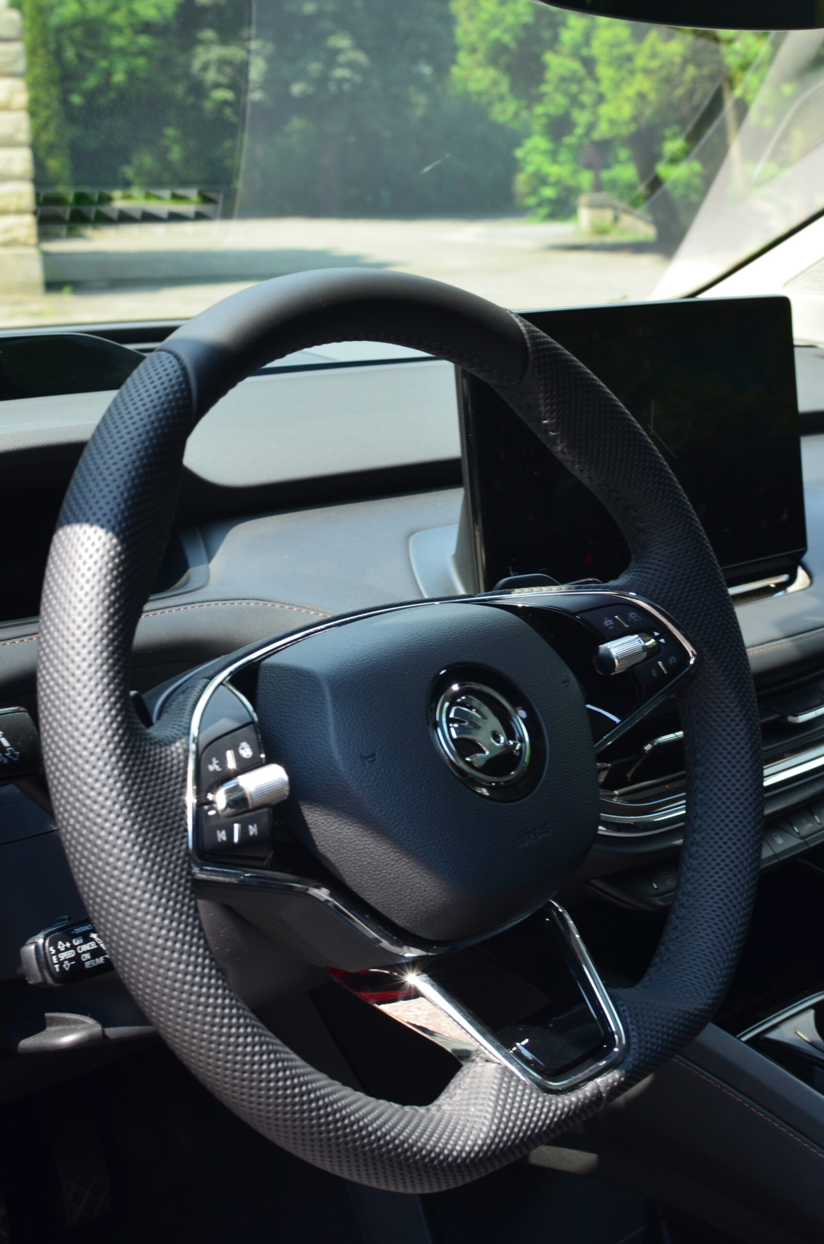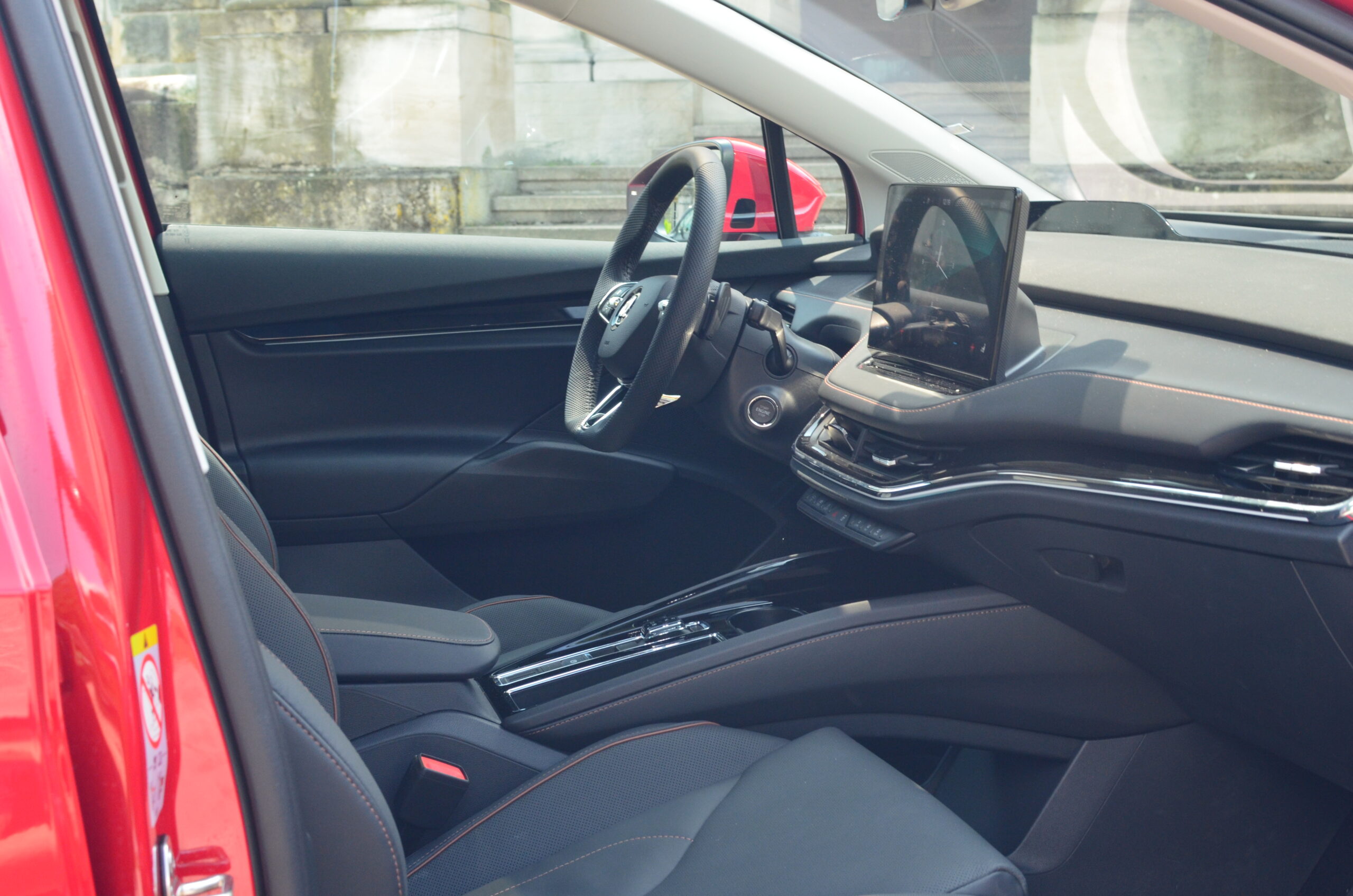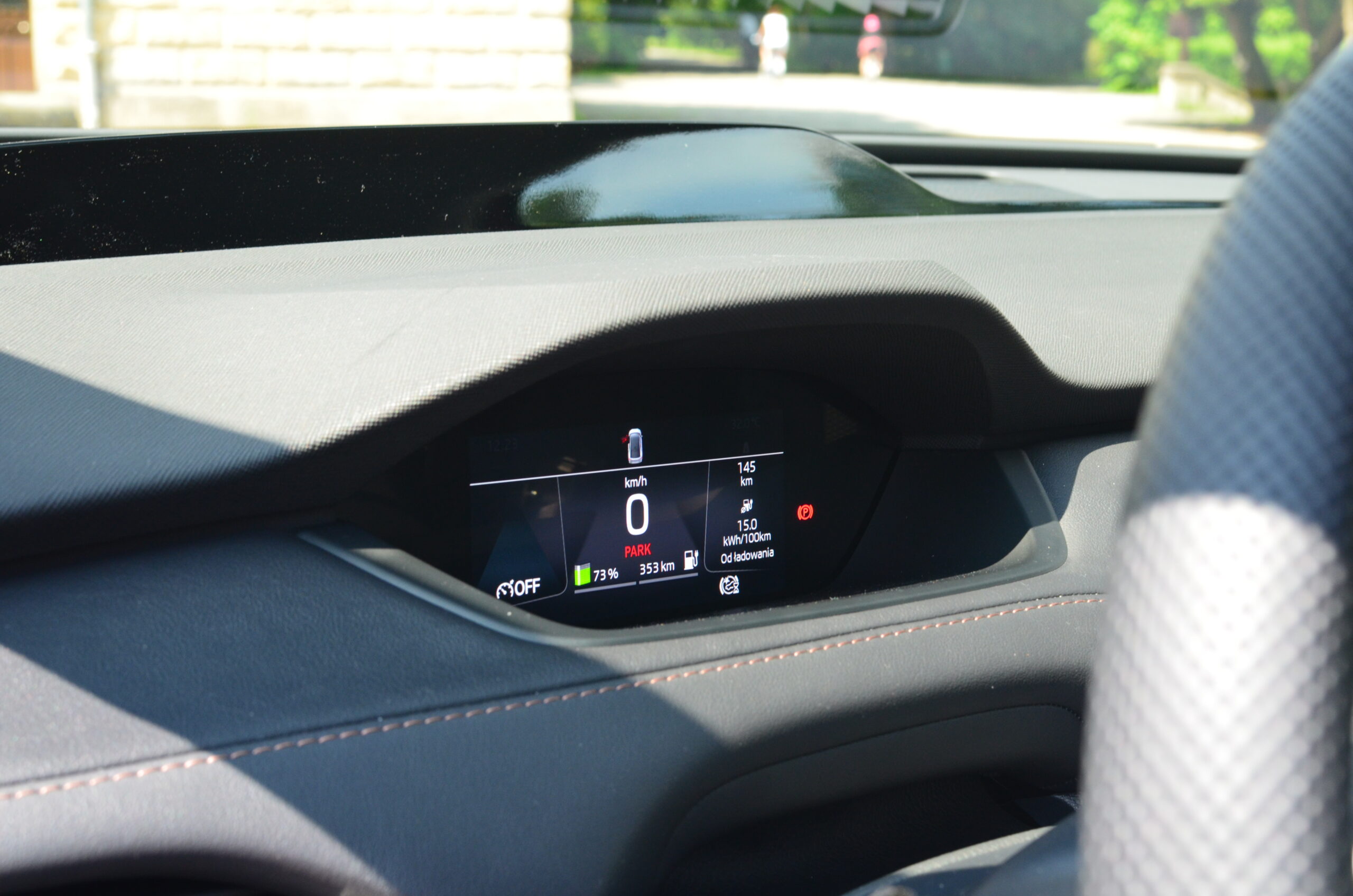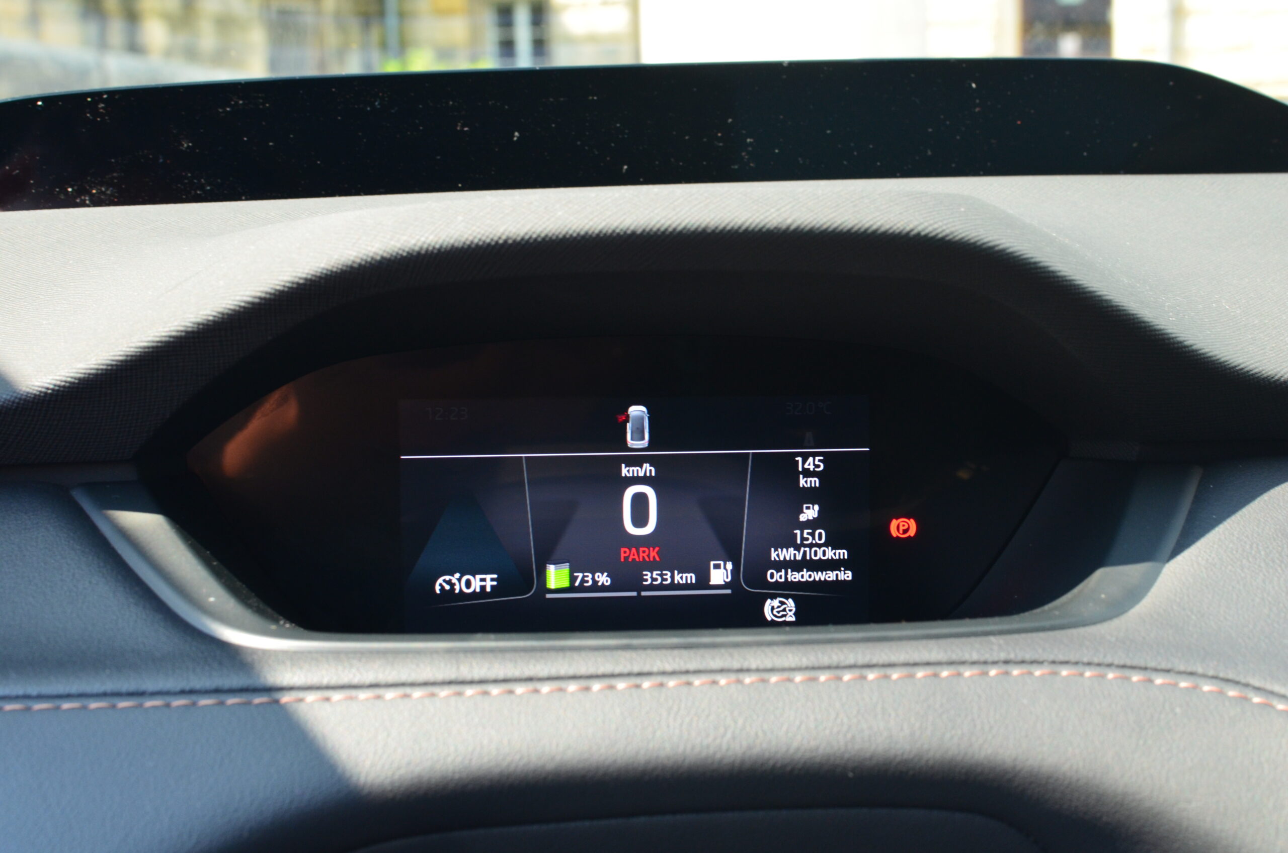 Materiały wykorzystane do wykończenia wnętrza są dobrej jakości, a ciekawe kontrastujące elementy, jak np. aluminiowe wstawki czy przeszycia w innym kolorze sprawiają, że całość prezentuje się stylowo i elegancko. Niestety będąc przy materiałach i wnętrzu muszę wspomnieć o spasowaniu, które w naszym egzemplarzu było… kiepskie. Przy trochę głośniejszym słuchaniu muzyki (około ¼ głośności) z okolic drzwi pasażera dobiegały wibracje, a na nierówności pojawiały się dziwne skrzypnięcia i stuknięcia z tylnej części pojazdu. Co ważne, kiedy odbierałem samochód, miał on nieco ponad 2900 kilometrów przebiegu. Rozumiem, że konstrukcja jest sztywniejsza przez umieszczenie akumulatorów w podłodze, ale jest to sfera, nad którą Skoda musi jeszcze trochę popracować.