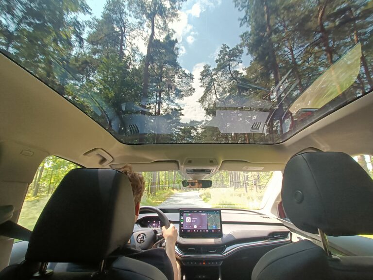Do testu otrzymaliśmy najwyższą wersję wyposażenia MAXX. W kwestii komfortu i podróżowania zaskoczeń jest wiele. Przede wszystkim sama wygoda i wyciszenie w samochodzie jest na dużym poziomie. Obojętnie czy poruszamy się w ruchu miejskim, podmiejskim czy też autostradowym. Samochodem jeździ się naprawdę komfortowo. Duży plus z wyświetlacz HUD, dzięki któremu nie trzeba było odrywać wzroku od drogi, a ilość informacji, które były na nim zawarte, była wystarczająca. Kolejnym pozytywnym zaskoczeniem są systemy, które znajdowały się na pokładzie Enyaq’a.  Wyposażono go w zaawansowane systemy wspomagające kierowcę, takie jak asystent pasa ruchu, automatyczne hamowanie awaryjne, czy adaptacyjny tempomat, co podnosi poziom bezpieczeństwa podczas jazdy i muszę przyznać, że one również spisywały się całkiem zadowalająco. Oczywiście zdarzały się potknięcia, takie jak nagłe gubienie pasów wyznaczających jezdnię czy prośby o trzymanie rąk na kierownicy, pomimo że cały czas była trzymana, ale nie było to uporczywe i nie utrudniało jazdy.