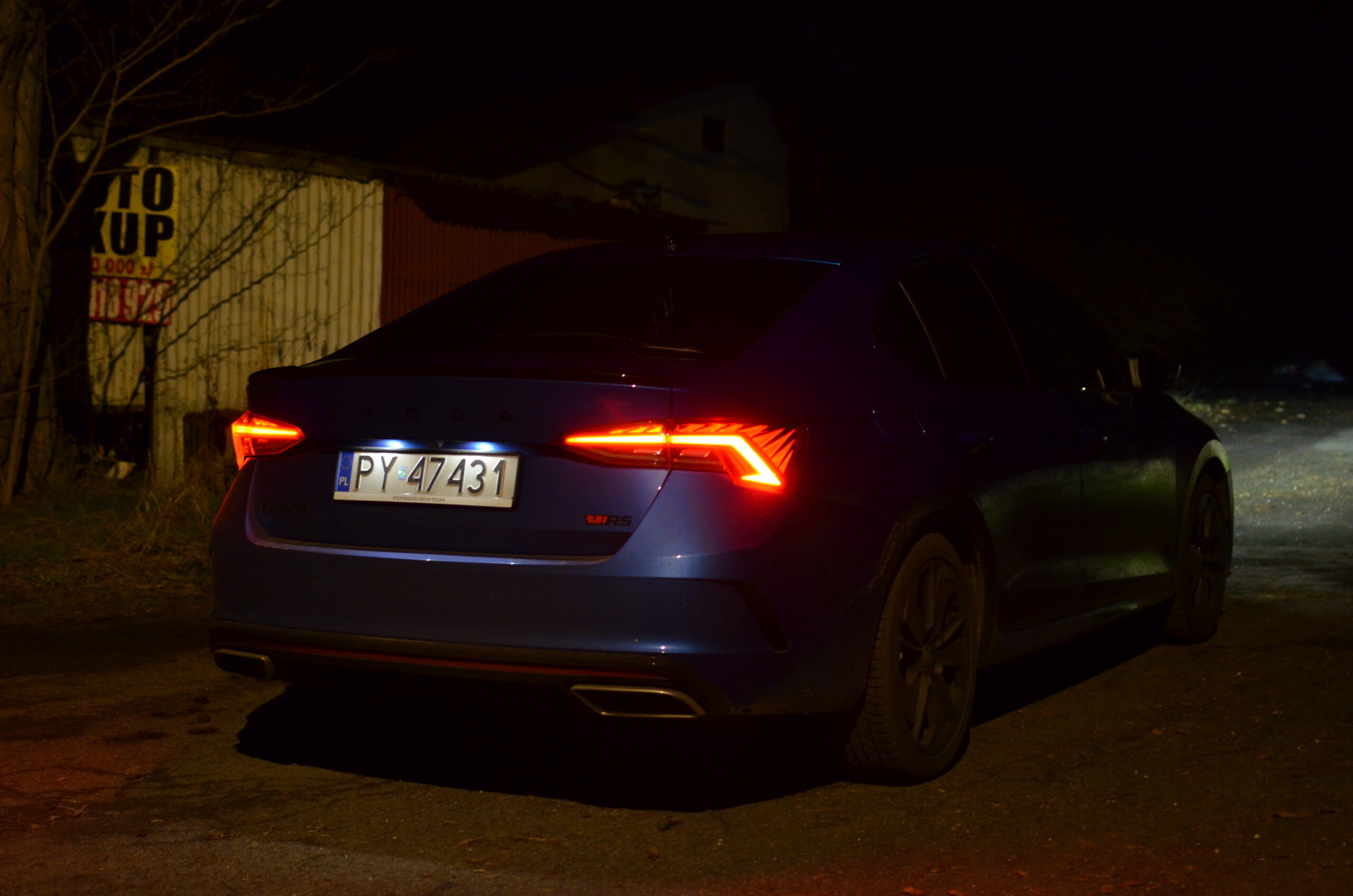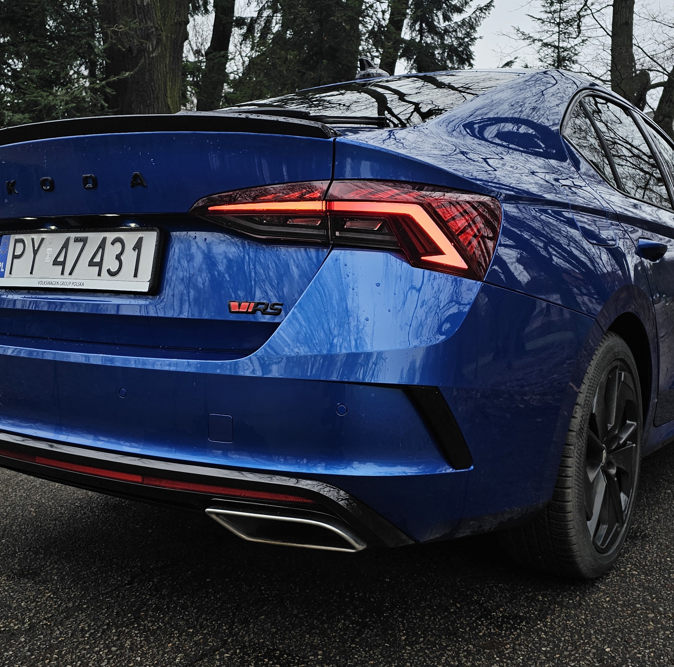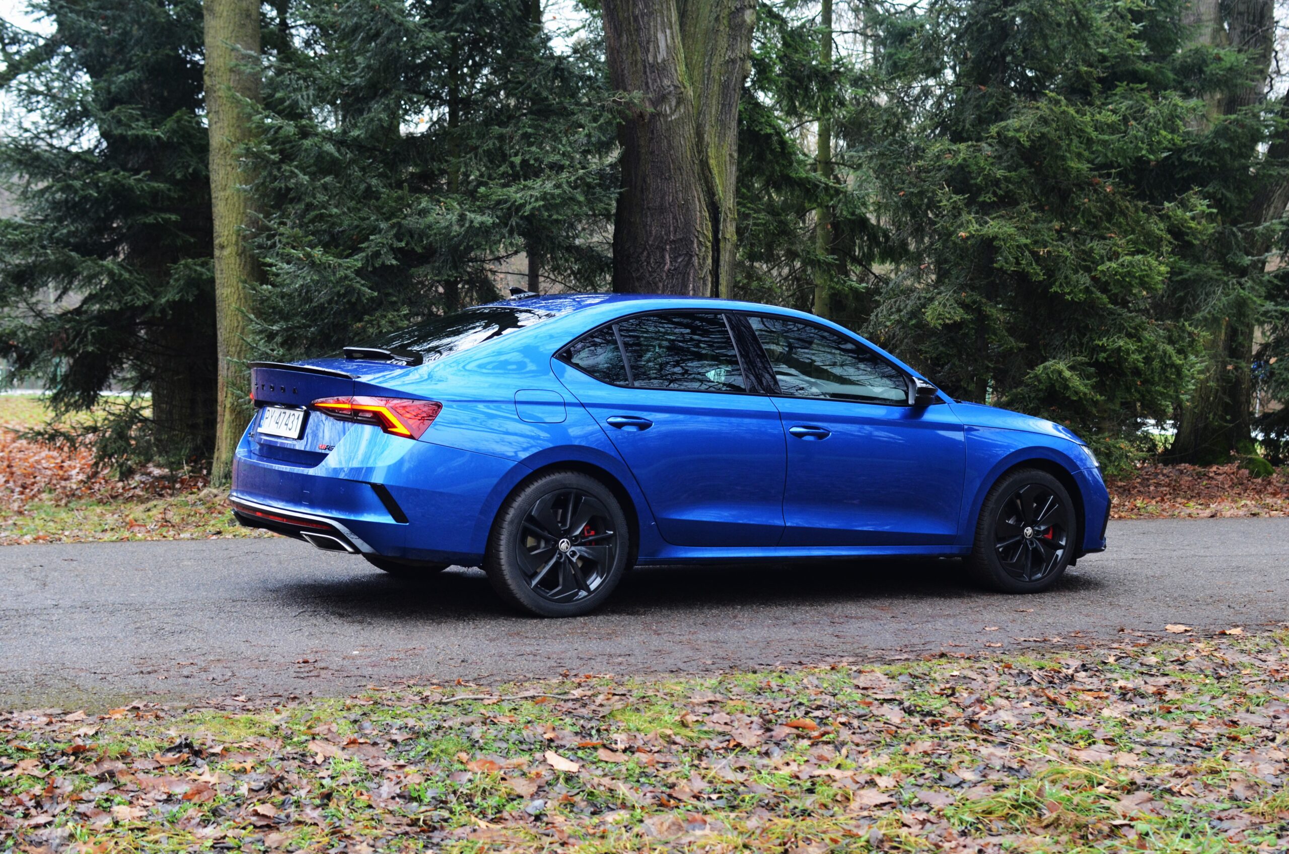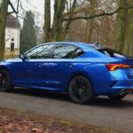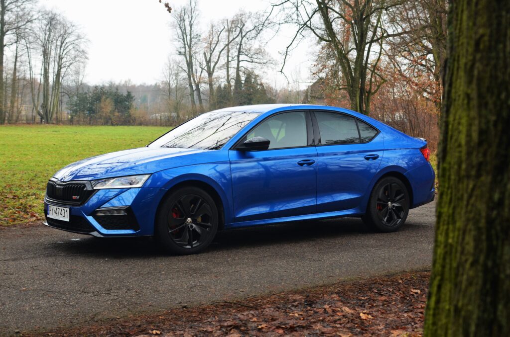 Z zewnątrz Skoda Octavia RS rzuca się w oczy. Ma bardzo ładną sylwetkę, z agresywnymi liniami, a całość prezentuje się bardzo świeżo. Z przodu zauważamy zmieniony zderzak w porównaniu do zwykłej wersji, wloty powietrza oraz reflektory Matrix LED. Z tyłu znajdują się przepiękne reflektory, które, moim zdaniem, stanowią najładniejszy element tego samochodu. Dodatkowo, na klapie bagażnika widnieje lotka, a dwie prawdziwe końcówki wydechu… niestety nie wydają nawet pół decybela dźwięku. To jedna z kilku rzeczy, które negatywnie zaskakują w tym samochodzie.