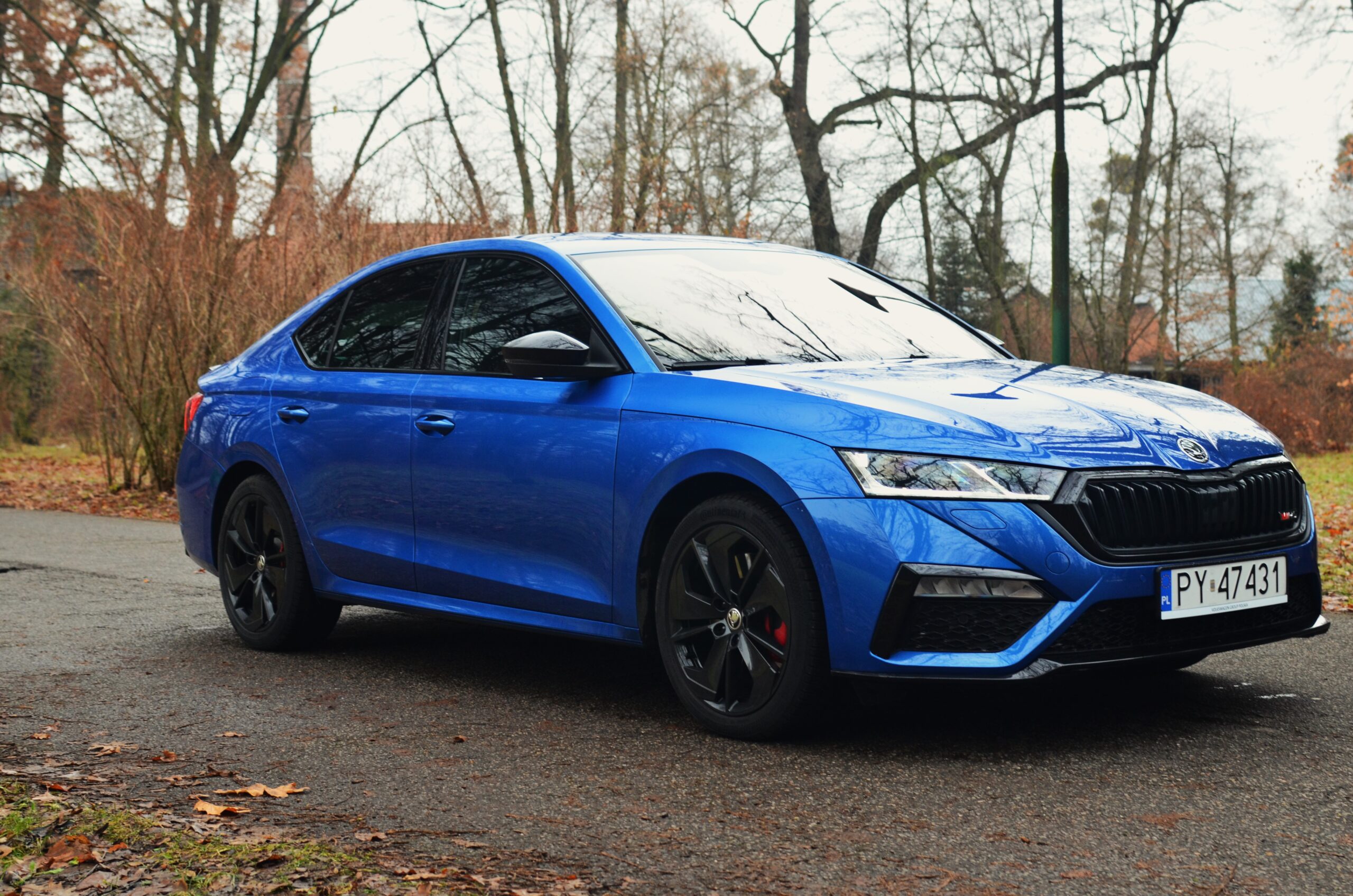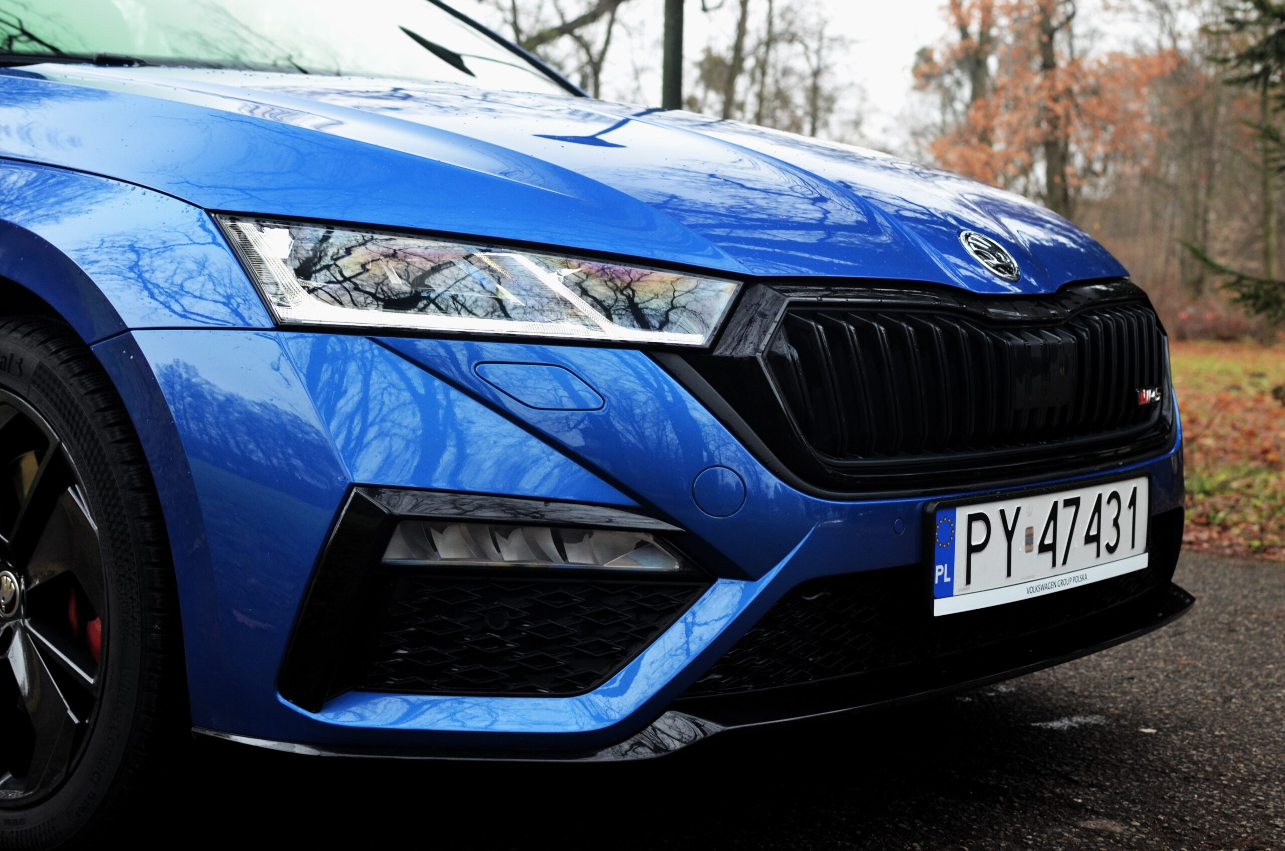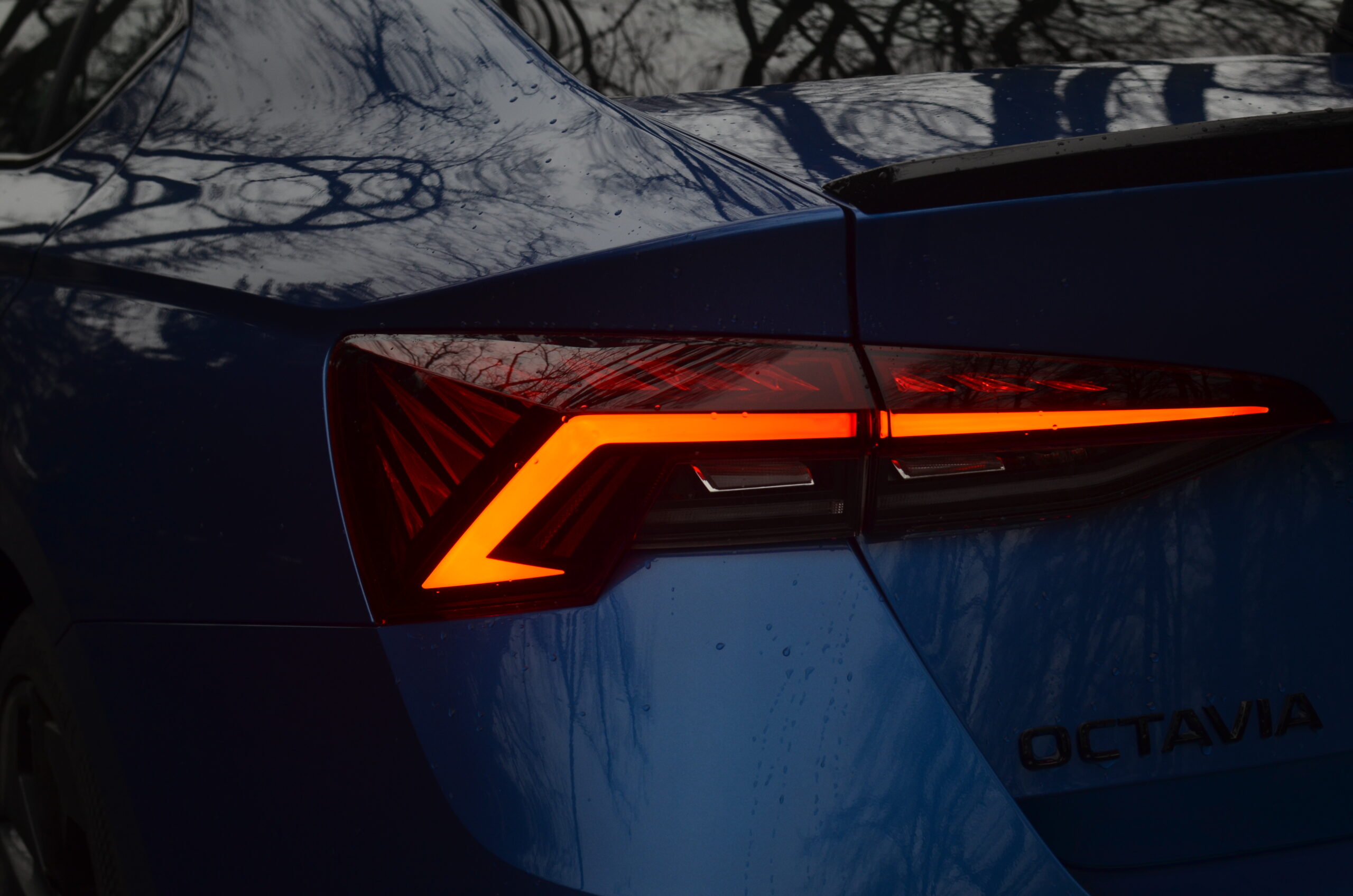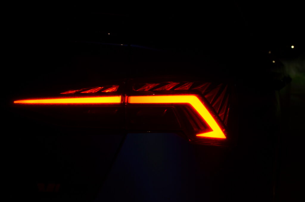 Z zewnątrz Skoda Octavia RS rzuca się w oczy. Ma bardzo ładną sylwetkę, z agresywnymi liniami, a całość prezentuje się bardzo świeżo. Z przodu zauważamy zmieniony zderzak w porównaniu do zwykłej wersji, wloty powietrza oraz reflektory Matrix LED. Z tyłu znajdują się przepiękne reflektory, które, moim zdaniem, stanowią najładniejszy element tego samochodu. Dodatkowo, na klapie bagażnika widnieje lotka, a dwie prawdziwe końcówki wydechu… niestety nie wydają nawet pół decybela dźwięku. To jedna z kilku rzeczy, które negatywnie zaskakują w tym samochodzie.
