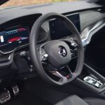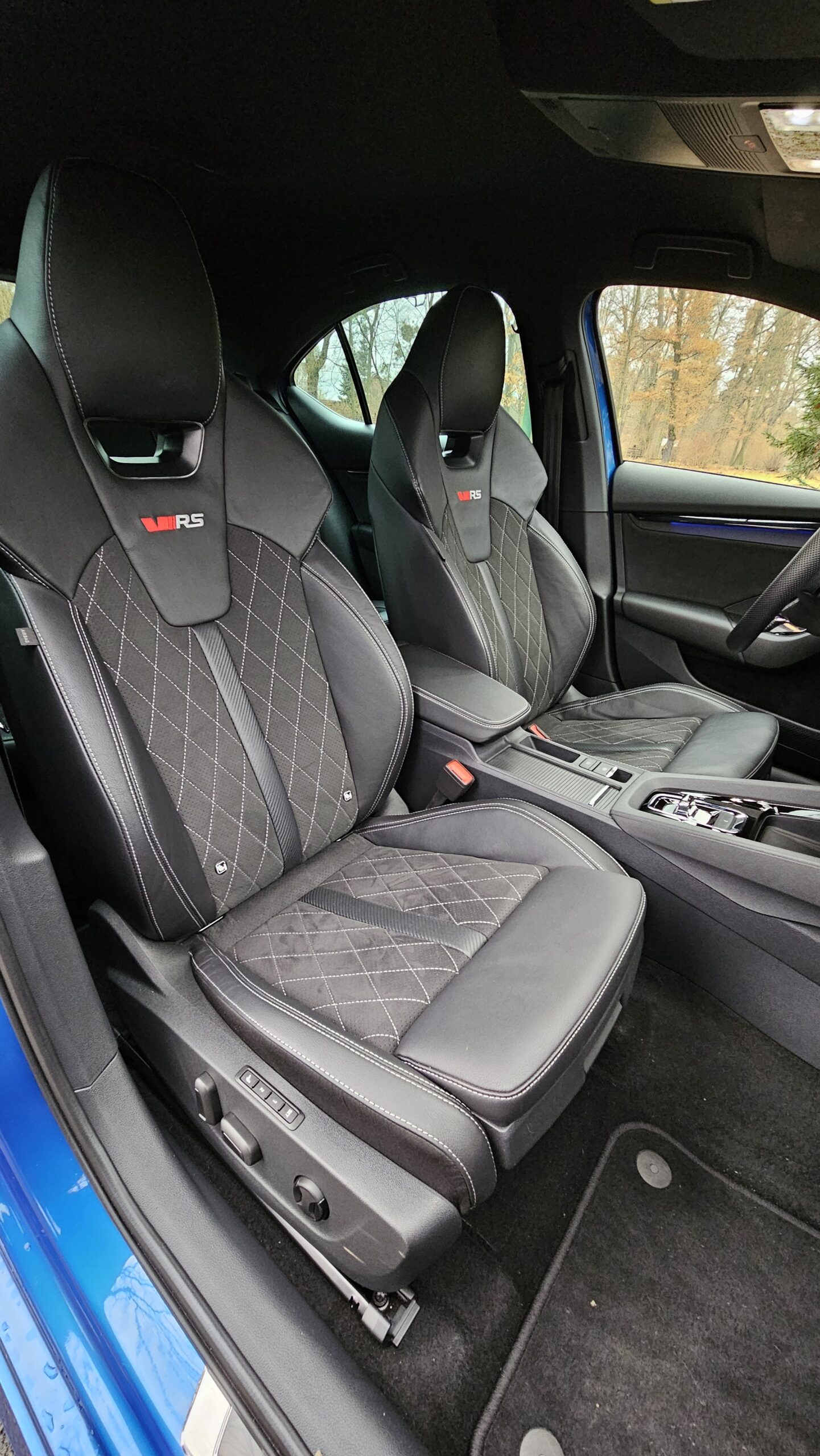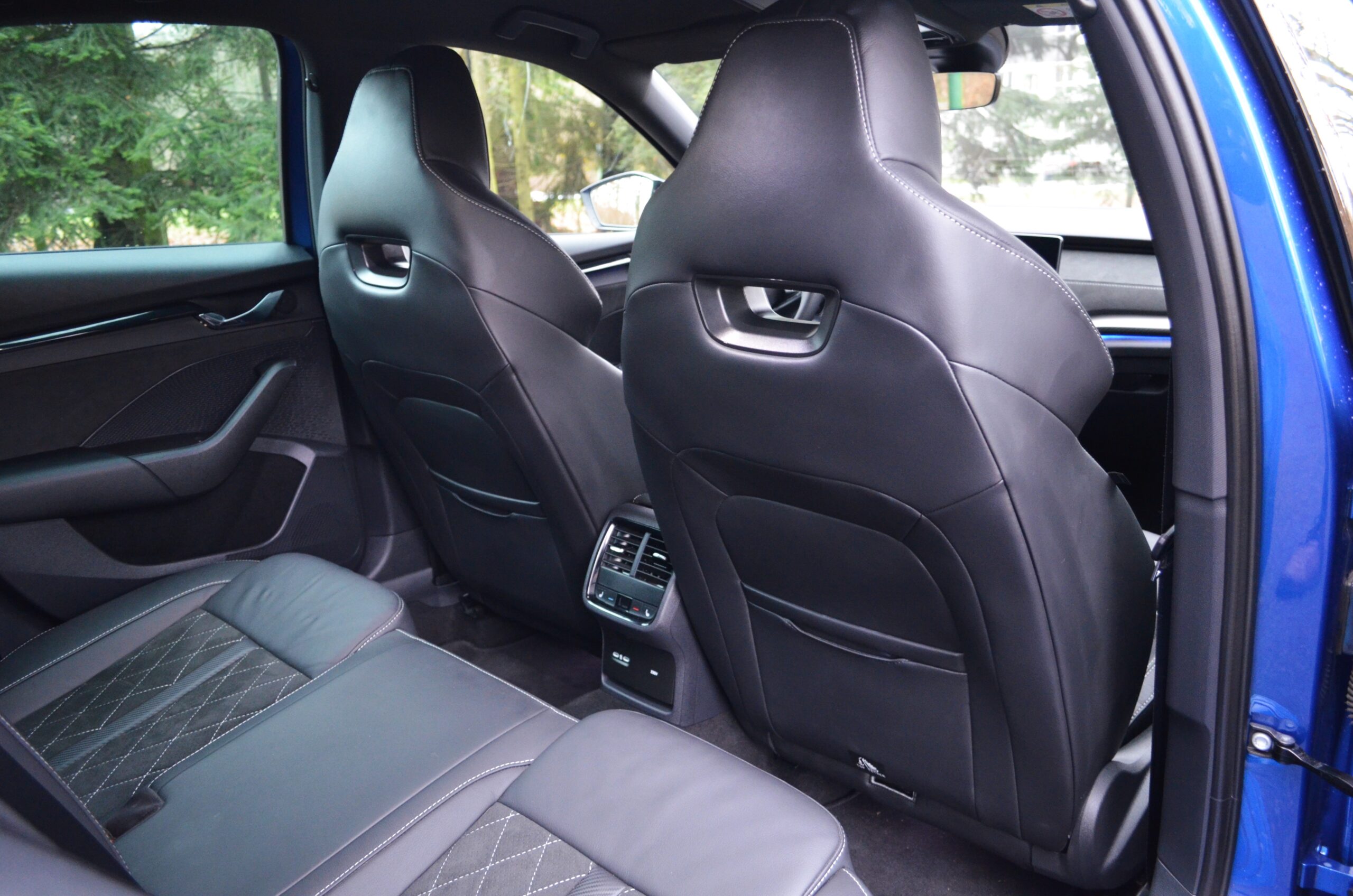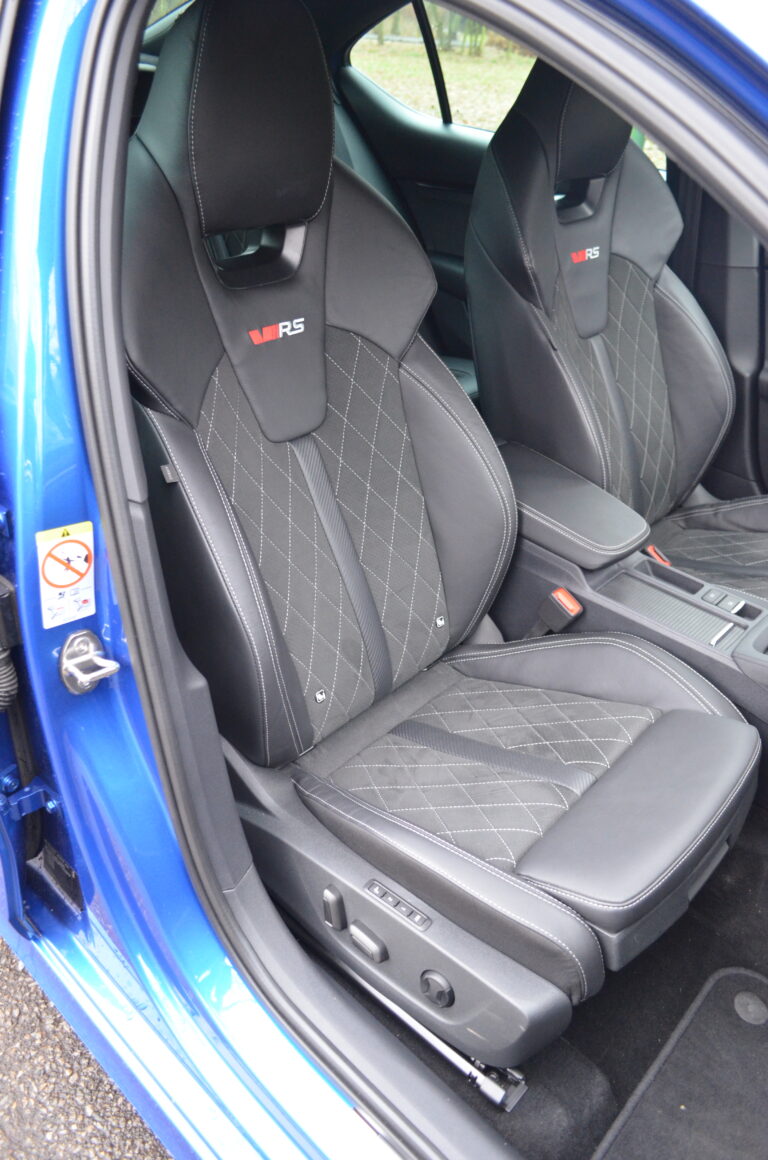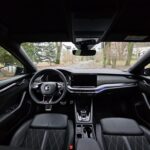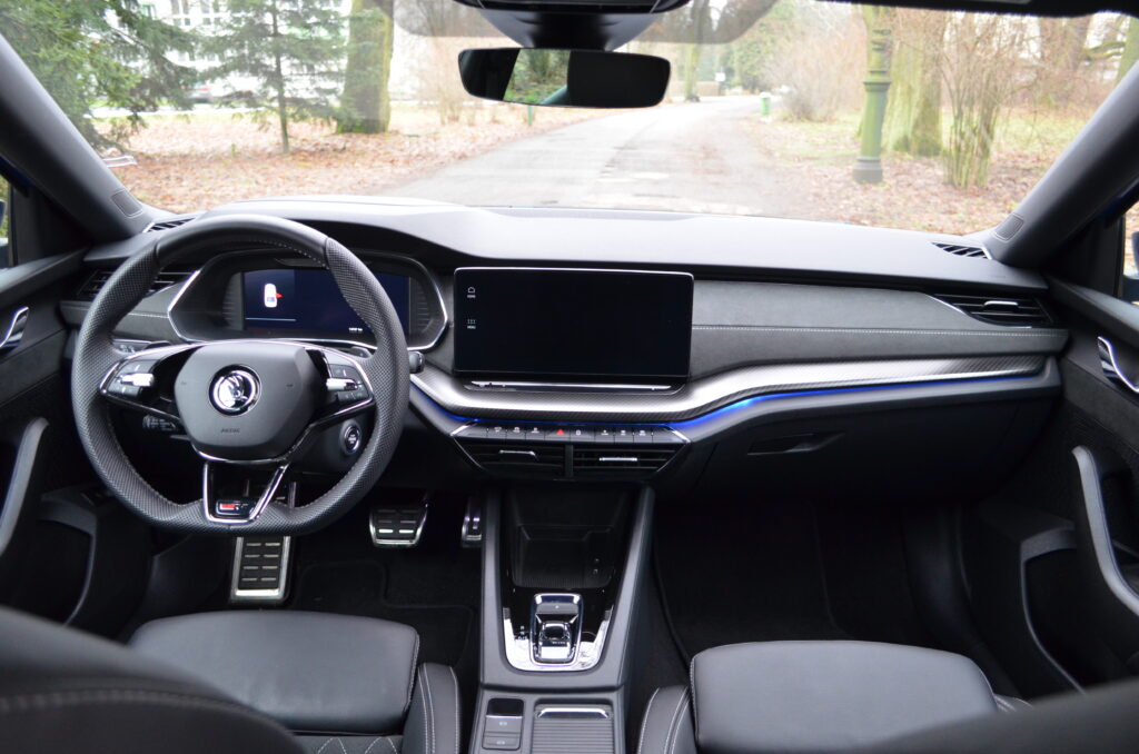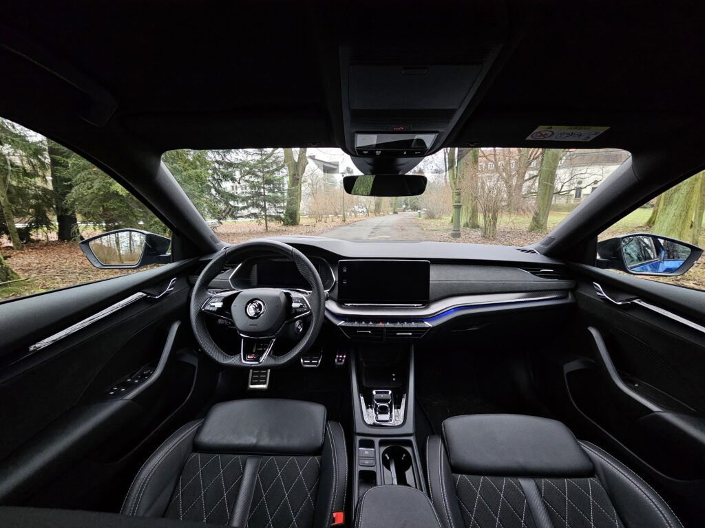 Kierownicę, tradycyjną dla nowszych modeli Skody, mogliśmy zobaczyć już np. w Enyaqu. Przednie fotele, oprócz ładnej prezentacji, dają kierowcy trochę sportowych odczuć. Siadając na nich po raz pierwszy, mogą wydawać się lekko twardawe, jednak nie wpływa to na wygodę. Oprócz niezłego trzymania bocznego, oferują wiele możliwości regulacji i są komfortowe.