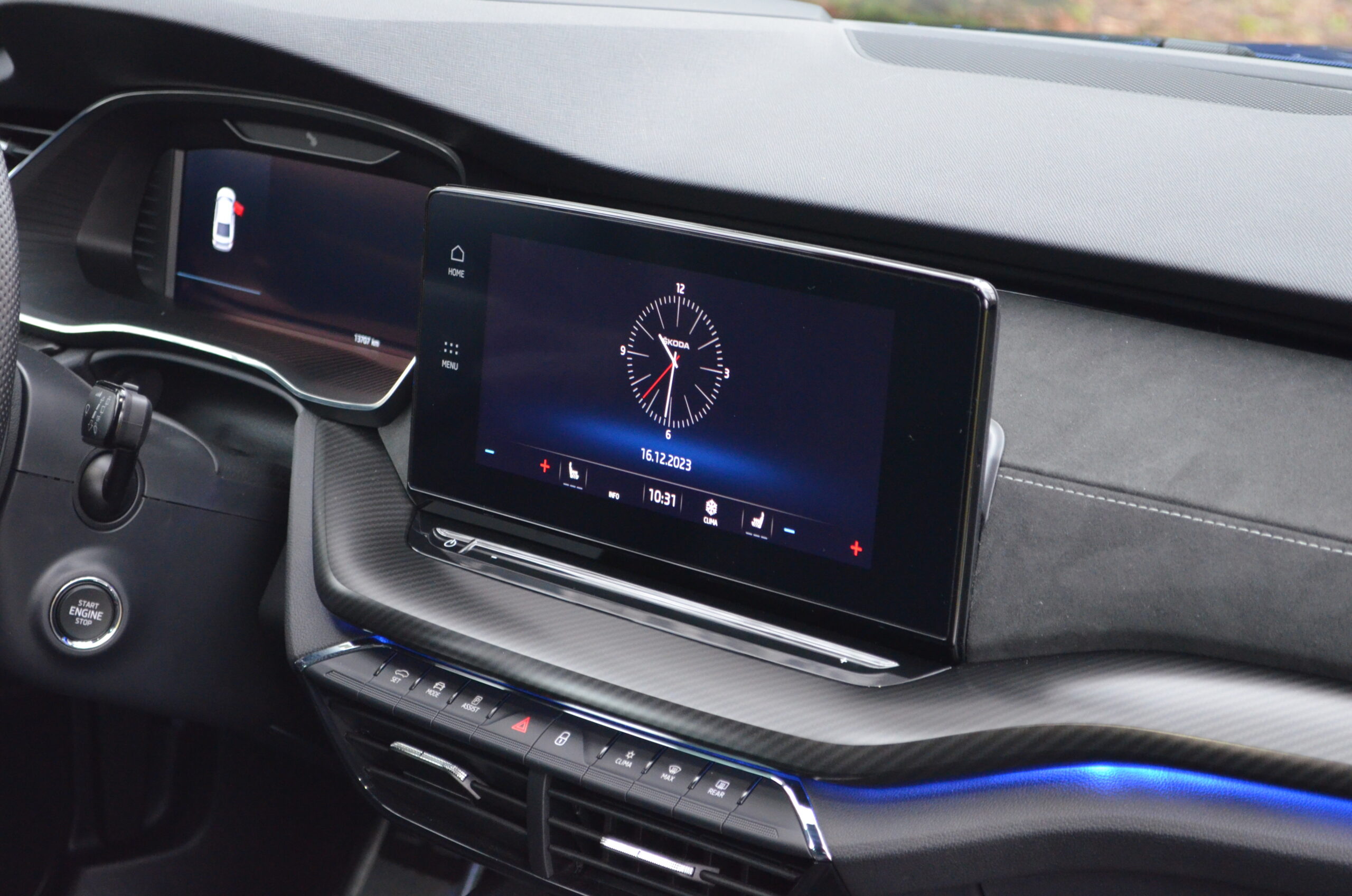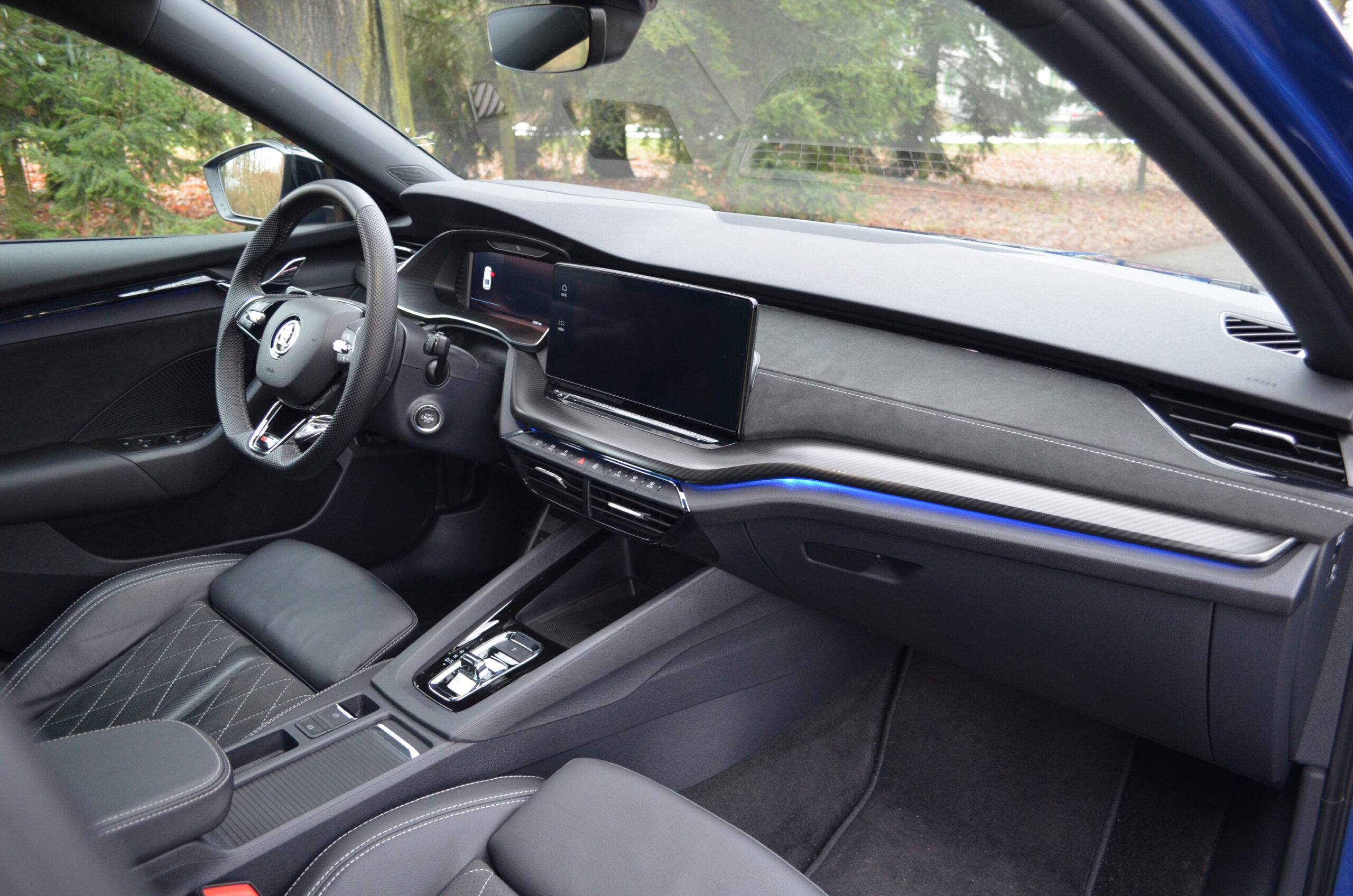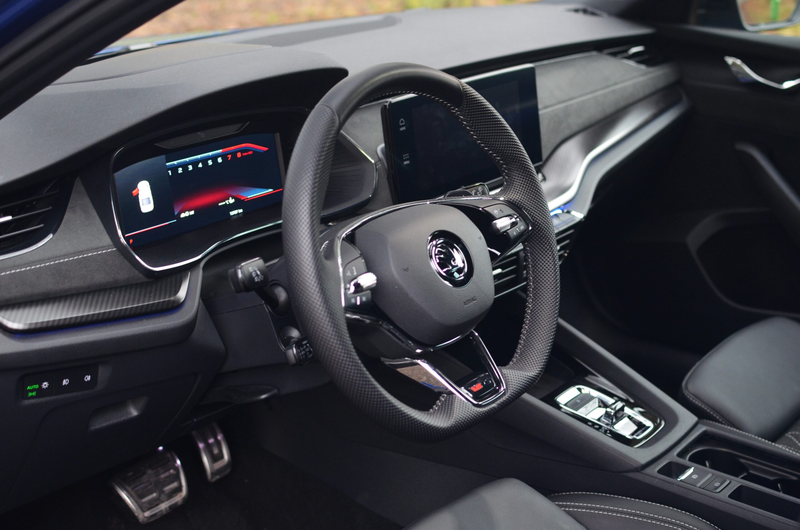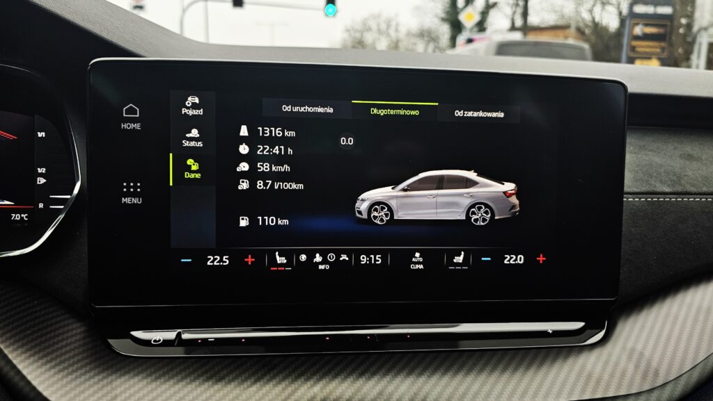 Wnętrze Octavii jest nowoczesne i bardzo ergonomiczne. Zaczynając od deski rozdzielczej przed kierowcą, znajdziemy ekran wirtualnych zegarów oraz obok niego ekran systemu infotainment. Oba ekrany posiadają bardzo ładną szatę graficzną i dobrą rozdzielczość. Na ekranie info-rozrywki zostało przeniesione sterowanie klimatyzacją i podgrzewanymi fotelami.